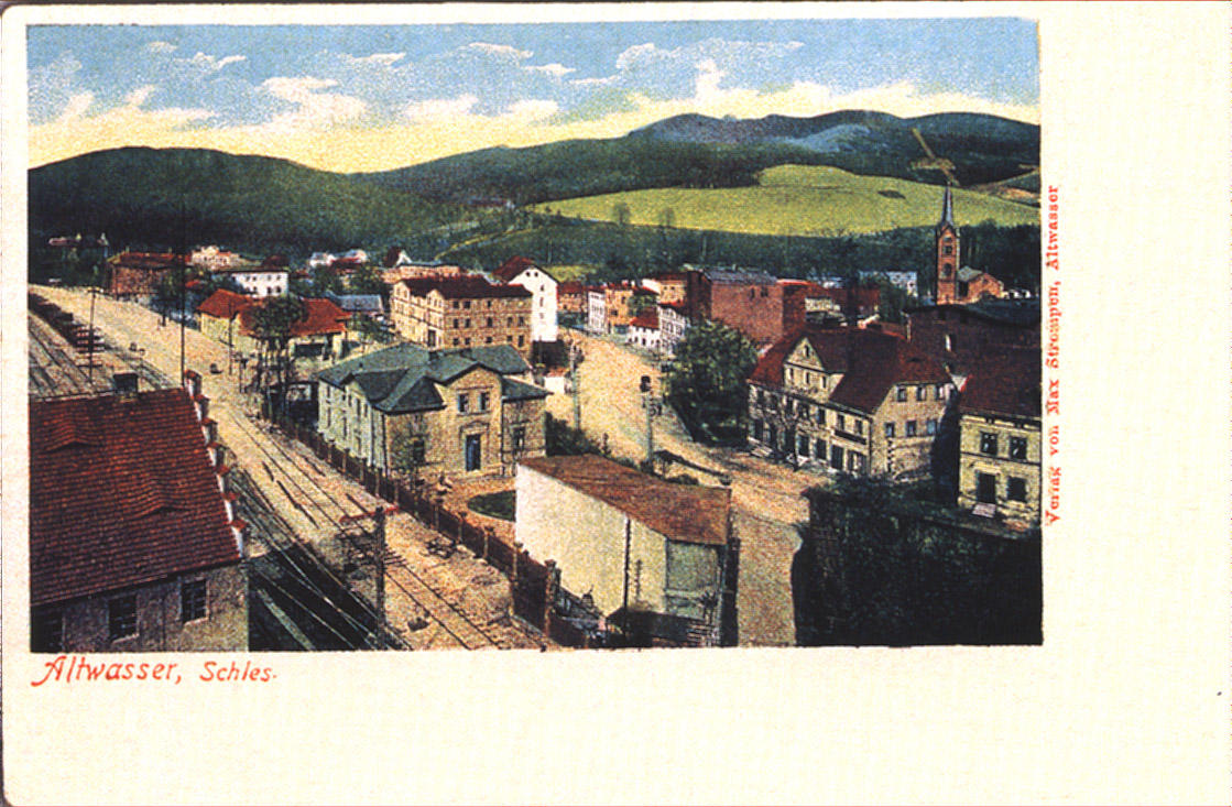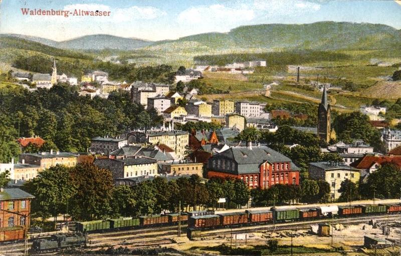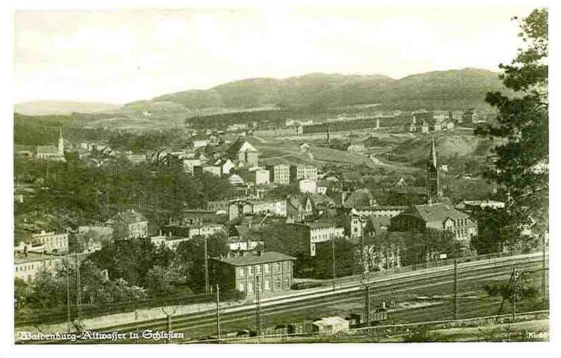 Widok na stację Wałbrzych Miasto (głowica północna) i osiedle Stary Zdrój od strony północno-zachodniej. Stara pocztówka.