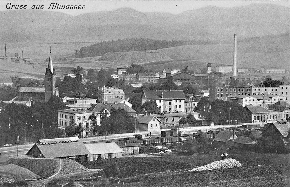 Widok na stację Wałbrzych Miasto i osiedle Stary Zdrój od strony północno-zachodniej. Z prawej strony wysoki komin należący do szybu "Chwalibóg".
