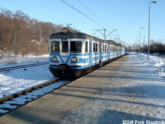 Pociąg osobowy z Wrocławia Głównego do Jeleniej Góry z ET21 na czele odjeżdża z peronu. Widać fragment ST43 z bruttem, który stoi na rozebranym krótko po wykonaniu zdjęcia torze nr 3. Widok w kierunku północnym (Jaworzyna Śląska, Wrocław).