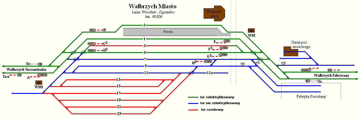 Wałbrzych Miasto - widok na nastawnię dysponującą WM, przejazd kolejowy na ul. Żeromskiego, a na drugim planie perony i budynek dworca (za nastawnią).
