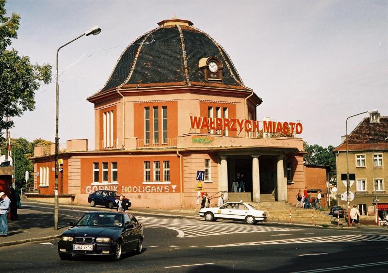 Symboliczna fotka przedstawiająca historię komunikacji miejskiej przy dworcu Miasto. W bruku widoczne pozostałości po wałbrzyskich tramwajach (wąskotorowych), które jeździły ul. Armii Krajowej w kierunku Szczawienka do przełomu lat 50. i 60. XX wieku. W chwili wykonania zdjęcia tramwaj już nie kursował; sieć trakcyjna rozpięta nad ulica należy do trolejbusów. Jeden z nich stoi właśnie na przystanku na drugim planie; trasę trajtków do dworca Miasto zlikwidowano w roku 1970. Ostały się ino autobusy, choć już nie w takiej formie, jak ten widoczny na zdjęciu. (dopisał wasiu).