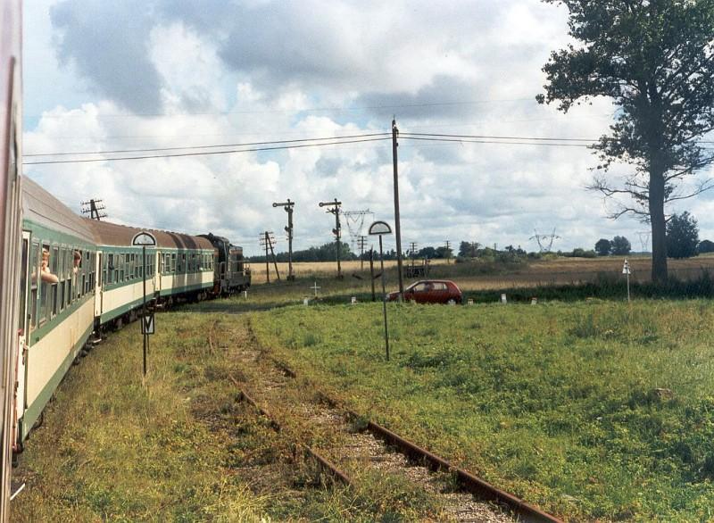 Krzyżowanie pociągu osobowego z Łeby do Lęborka z pospiesznym na dwóch stonkach. W lewo Lębork, w prawo Wrzeście/Łeba i Rybno/Wejherowo.