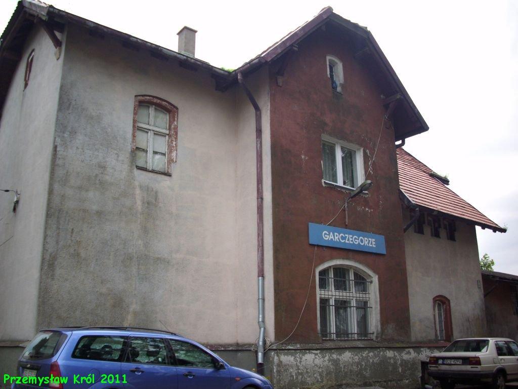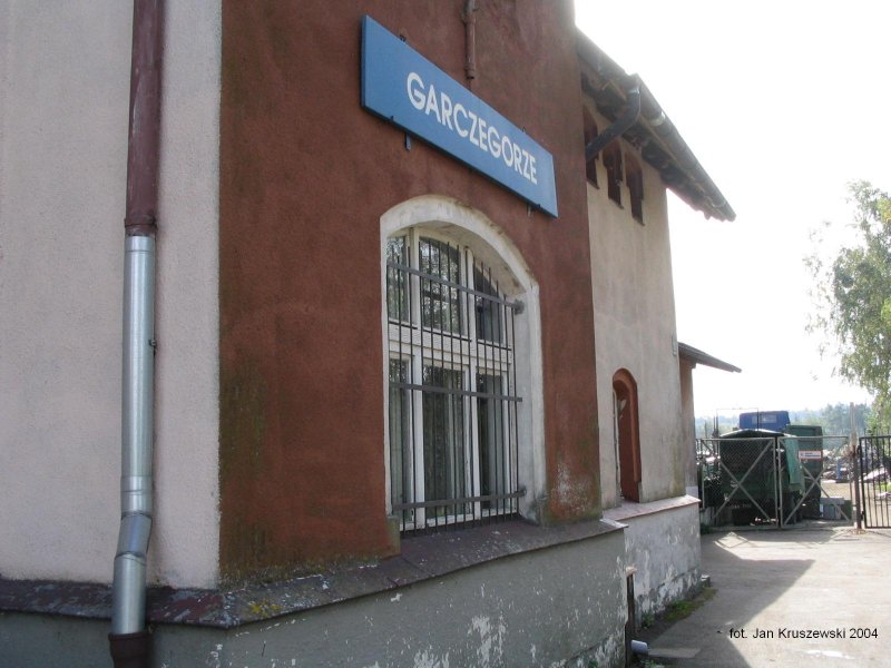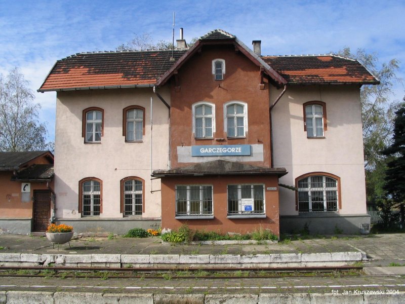 Skan zdjęcia z Nowych Sygnałów nr 16/98 ilustrującego dworzec w Garczegorzach. Na parterze, w przybudówce mieściła się nastawnia dysponująca. Widok od strony peronów i wjazdu z Lęborka, w kierunku północno-zachodnim.
