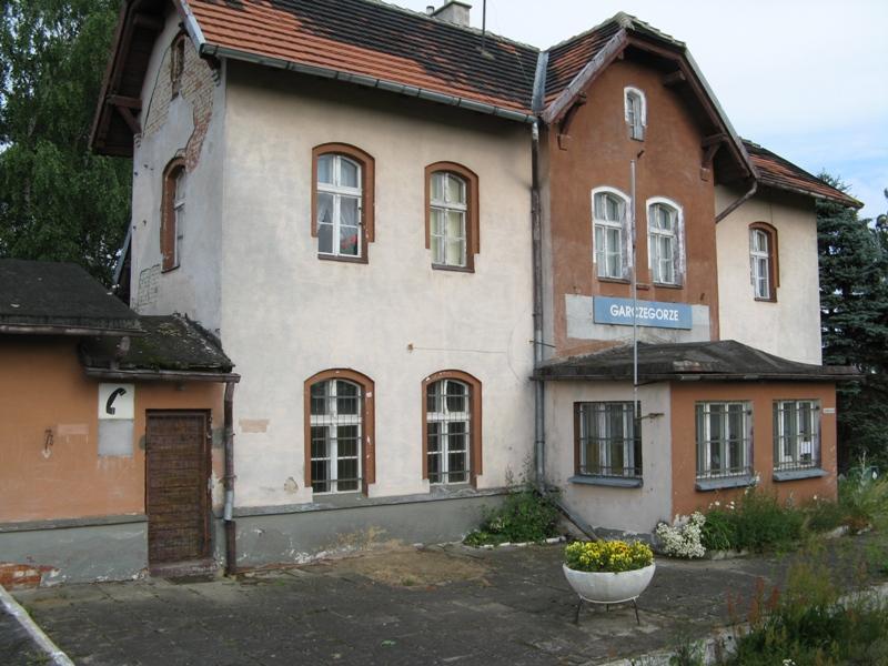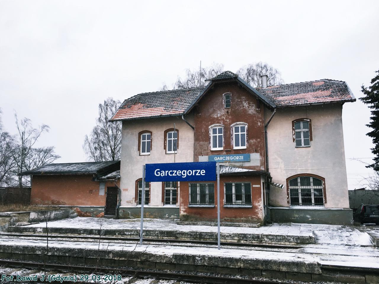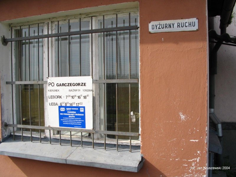 Budynek dworca od strony peronów. Widok w kierunku zachodnim: w lewo Lębork, w prawo Rybno/Wejherowo, Wrzeście/Łeba. Na parterze dworca mieściła się nastawnia dysponująca. Góra, jak widać zamieszkana.