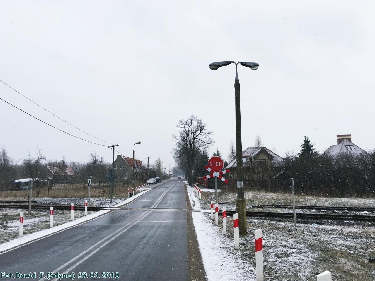 Przejazd kolejowy na lokalnej drodze. Droga prowadzi do skrzyżowania z DW 214 i główną częścią miejscowości. W lewo Łeba i Choczewo/Wejherowo, w prawo Lębork.