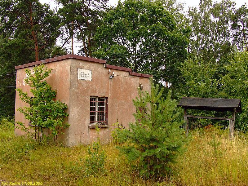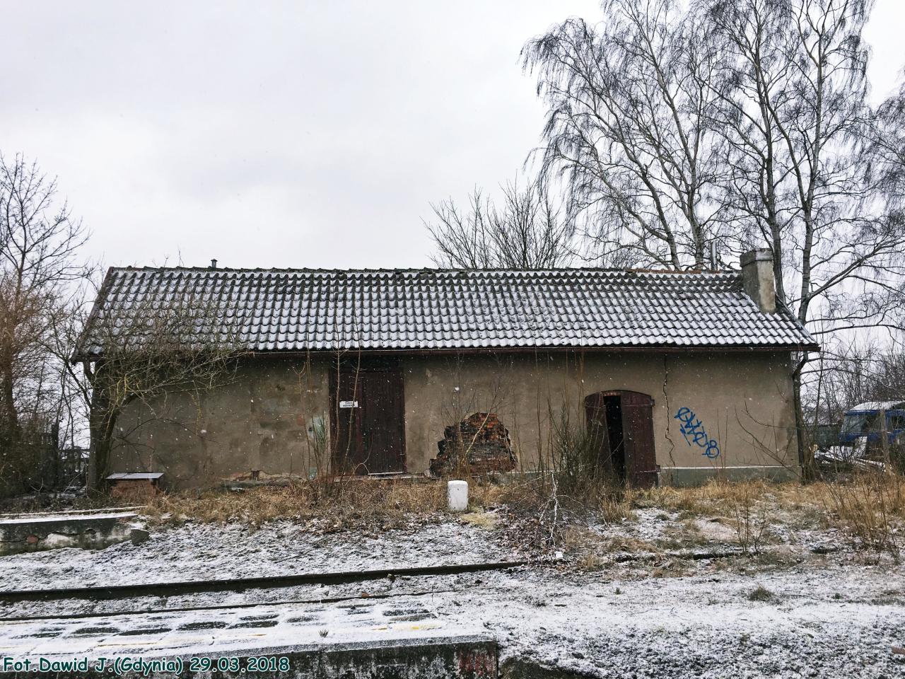 Budynek gospodarczy posiadający pomieszczenia WC widoczny od strony torów. W lewo Lębork, w prawo Łeba i Choczewo/Wejherowo.