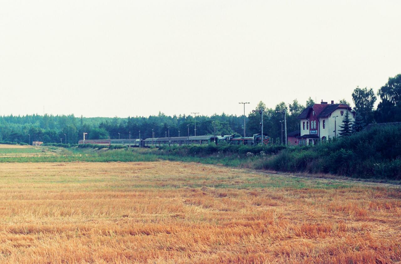 Pociąg osobowy z Łeby do Lęborka czeka na krzyżowanie. Widok w kierunku południowym (Lębork).