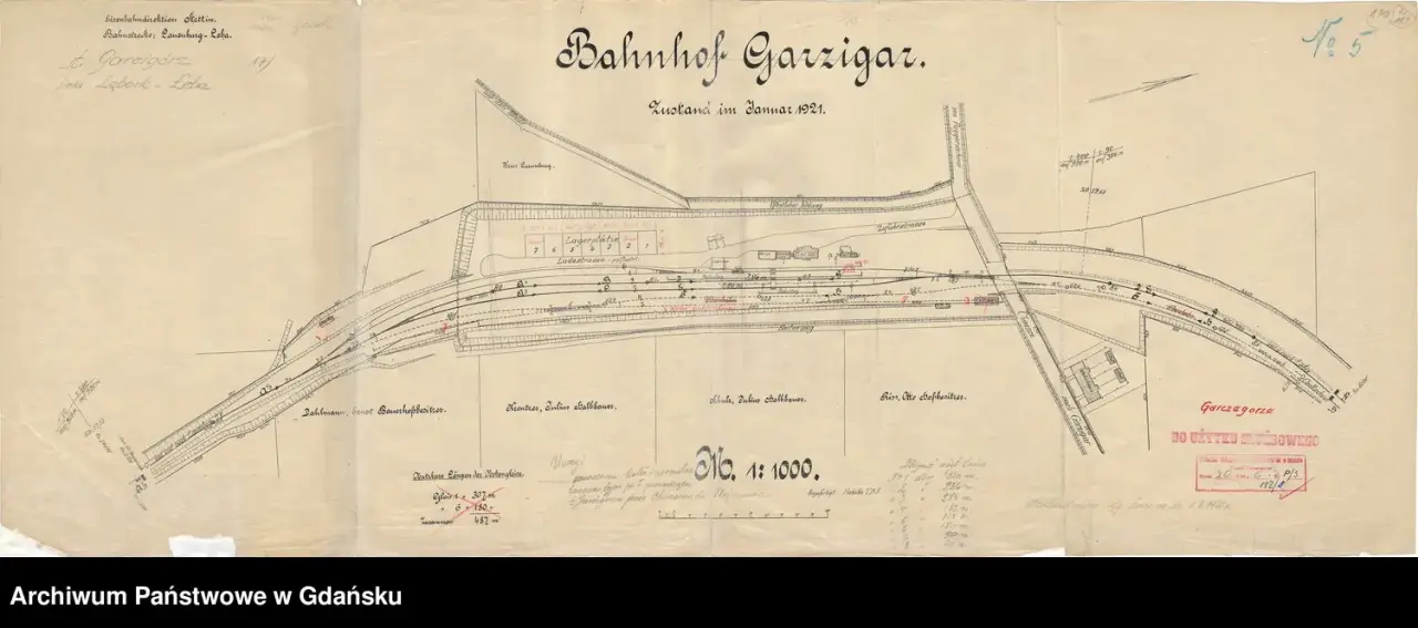Plan stacji Garczegorze. Stan na styczeń 1921r. Materiał Archiwum Państwowego w Gdańsku.