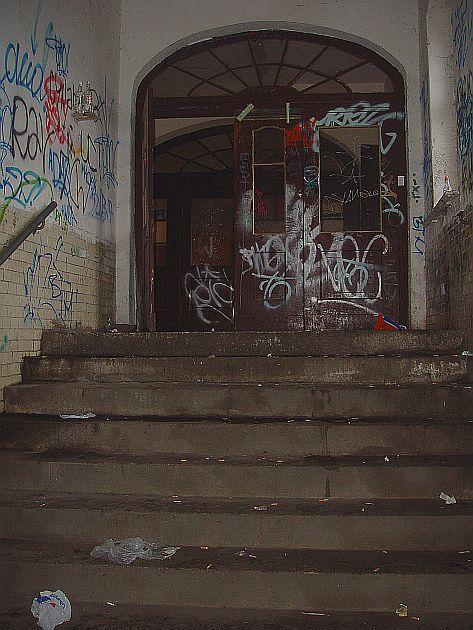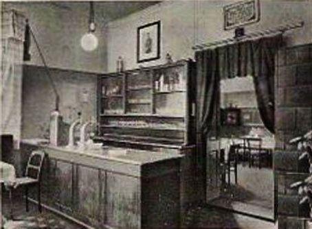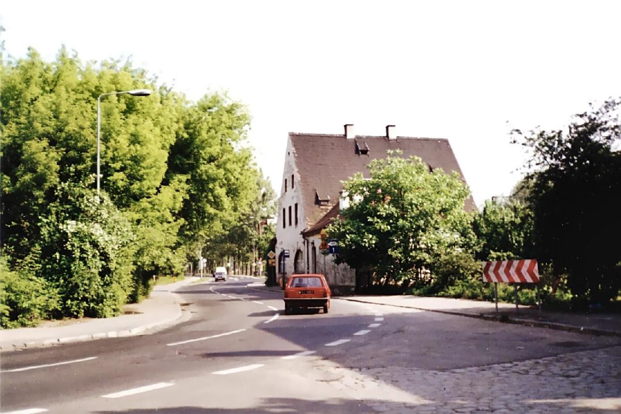 Miejsce parkowania samochodu, niegdyś otoczone płotem, to część letnia restauracji - ogródek. Zadaszone drzwi prowadziły do restauracji dworcowej z dużymi oknami od ulicy.
