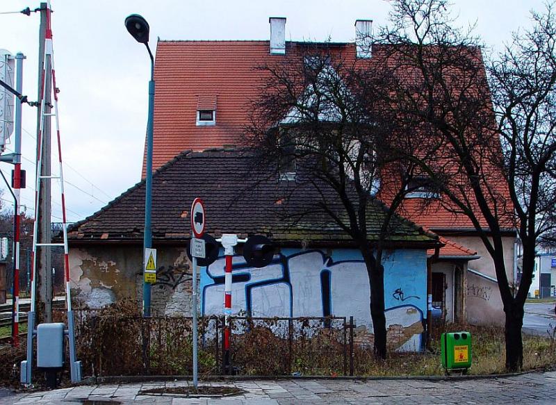 Stacja kolejowa Wrocław Kuźniki od południa graniczy z przejazdem kolejowym przez ul.Koszalińską.Z prawej zabudowa stacji:fragment budynku dworca, na planie drugim - fragment nastawni WK.