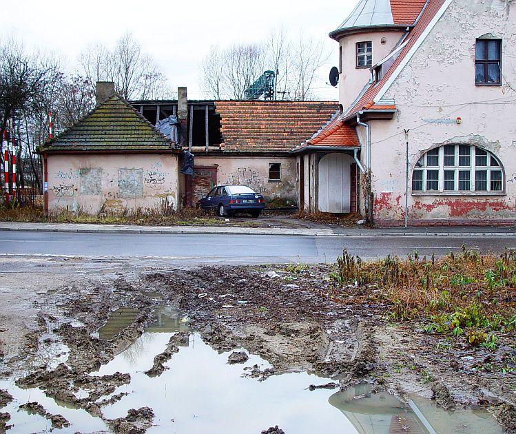 Budynek dworcowy, w zaniedbanym otoczeniu, niszczeje.