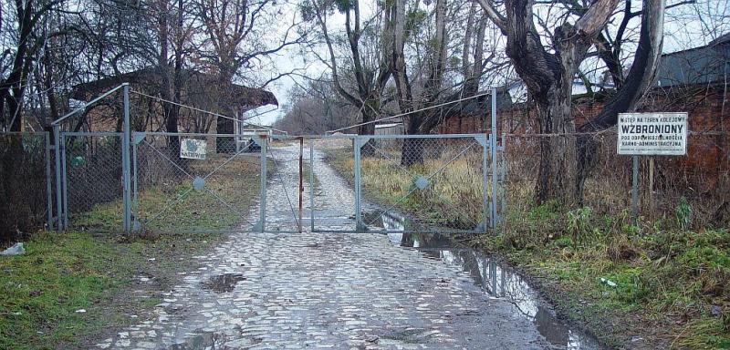 Wjazd na stację towarową z ul.Metalowców.Tabliczka na bramie: "Klucz w nastawni".
