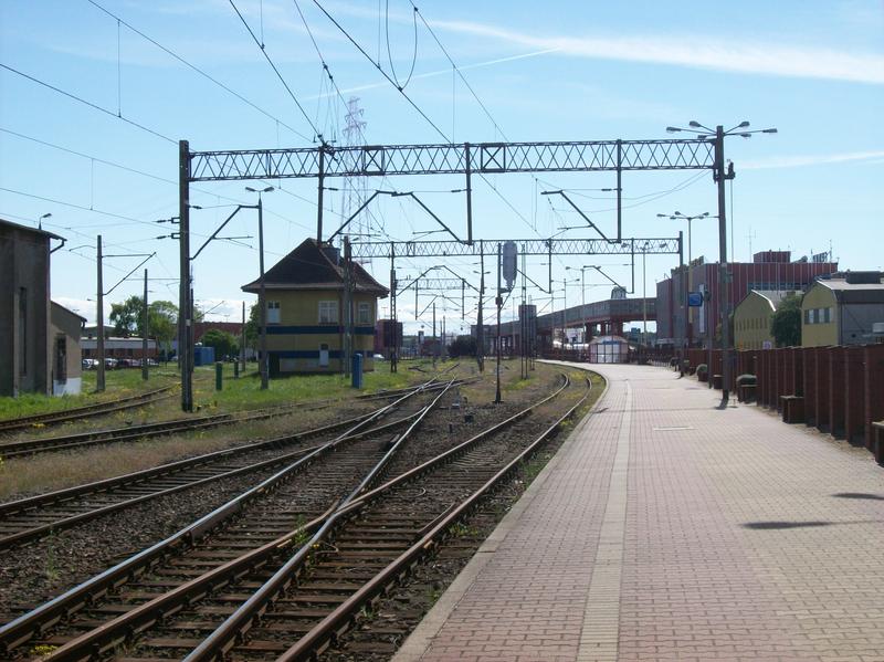 Widok z krańca linii, po lewej tor przy peronie, a za lewym skrajem zdjęcia terminal promowy pasażersko-samochodowo-kolejowych promów morskich;