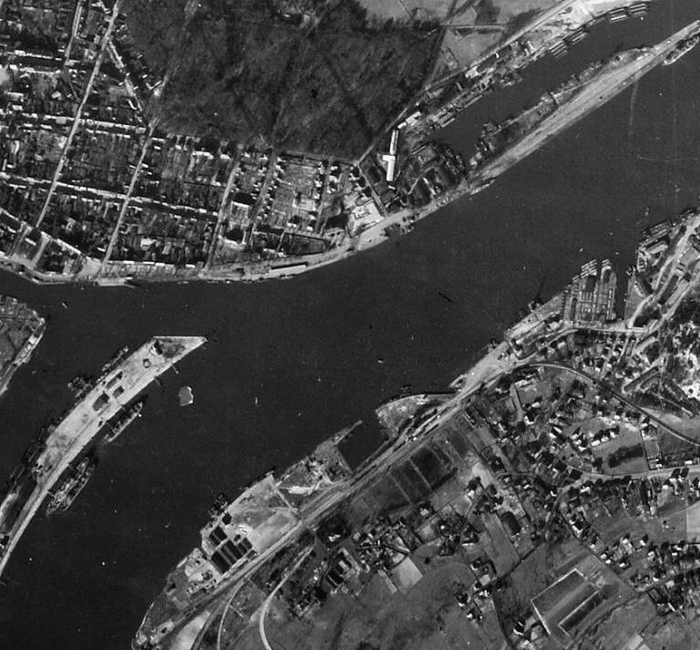 Centralna część portu w Świnoujściu. Postawienie min w nocy z 16 na 17 sierpnia 1944 r. miało zatrzymać statki w porcie, aby nie mogły płynąć do Szczecina. Powyższe zdjęcie zostało wykonane w 1943 roku i przedstawia statki mieszkalne używane przez niemiecką marynarkę wojenną oraz kilka mniejszych okrętów wojennych. Nabrzeża pokazane na zdjęciu były celem dużego amerykańskiego ataku na Świnoujście 12 marca 1945 r., gdzie uciekinierzy czekający na transport ze Świnoujścia zostali poważnie dotknięci.