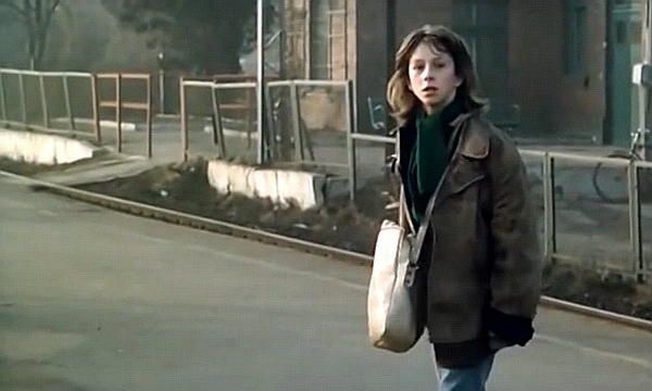 Scena kolejowa z filmu "300 mil do nieba", reż. Maciej Dejczer, zdjęcia Krzysztof Ptak, na peronie stoi Kama Kowalewska.