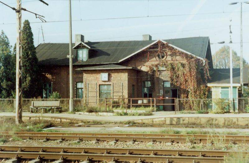Budynek stacyjny po renowacji. Na ścianach budynku widoczne ślady naprawiania po uszkodzeniu go podczas ostrzału artyleryjskiego w "BITWIE ŁÓDZKIEJ" w 1914 roku.
