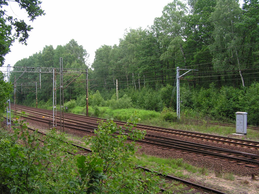 Wiadukt na linii Łódź Kaliska - Tomaszów Mazowiecki - Dębica nad linią Warszawa Centralna - Katowice. W lewo Tomaszów Mazowiecki, w prawo Łódź. 29,8/ 107,7 km.
