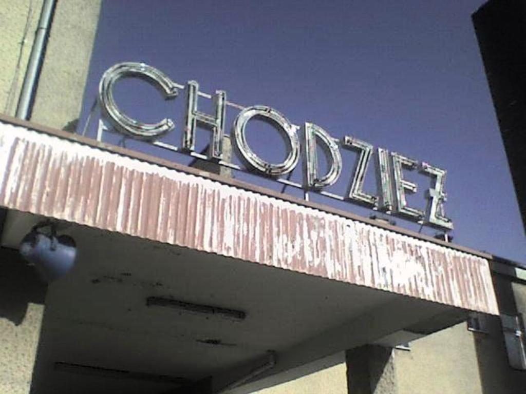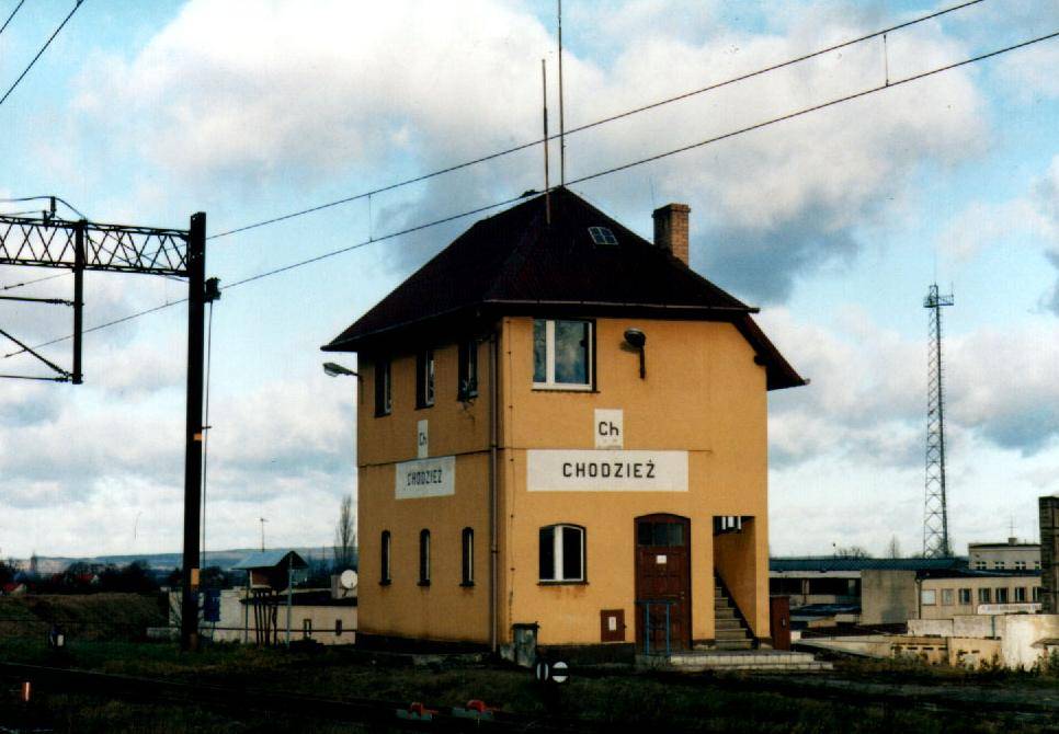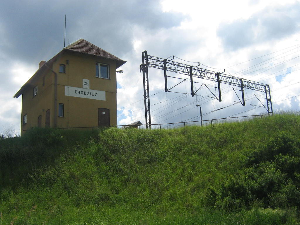 Pociąg towarowy z Piły do Poznania Franowa, z wagonami wąskotorowymi z Koszalina do Czech, stoi na stacji w Chodzieży. W lewo Rogoźno Wielkopolskie/Poznań, w prawo Piła i Gołańcz.