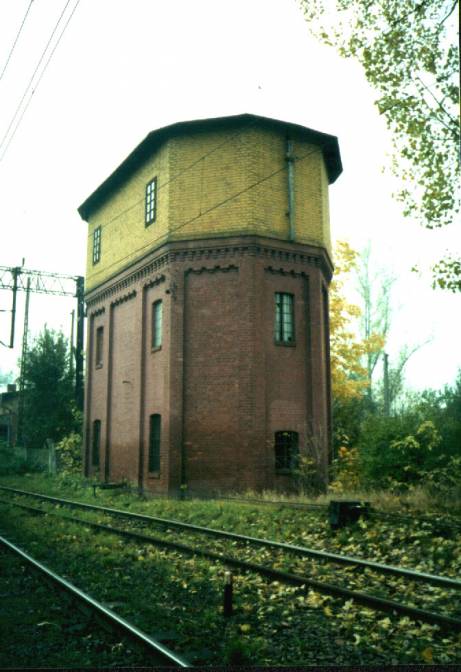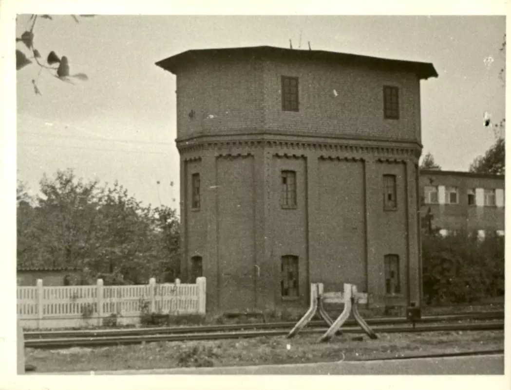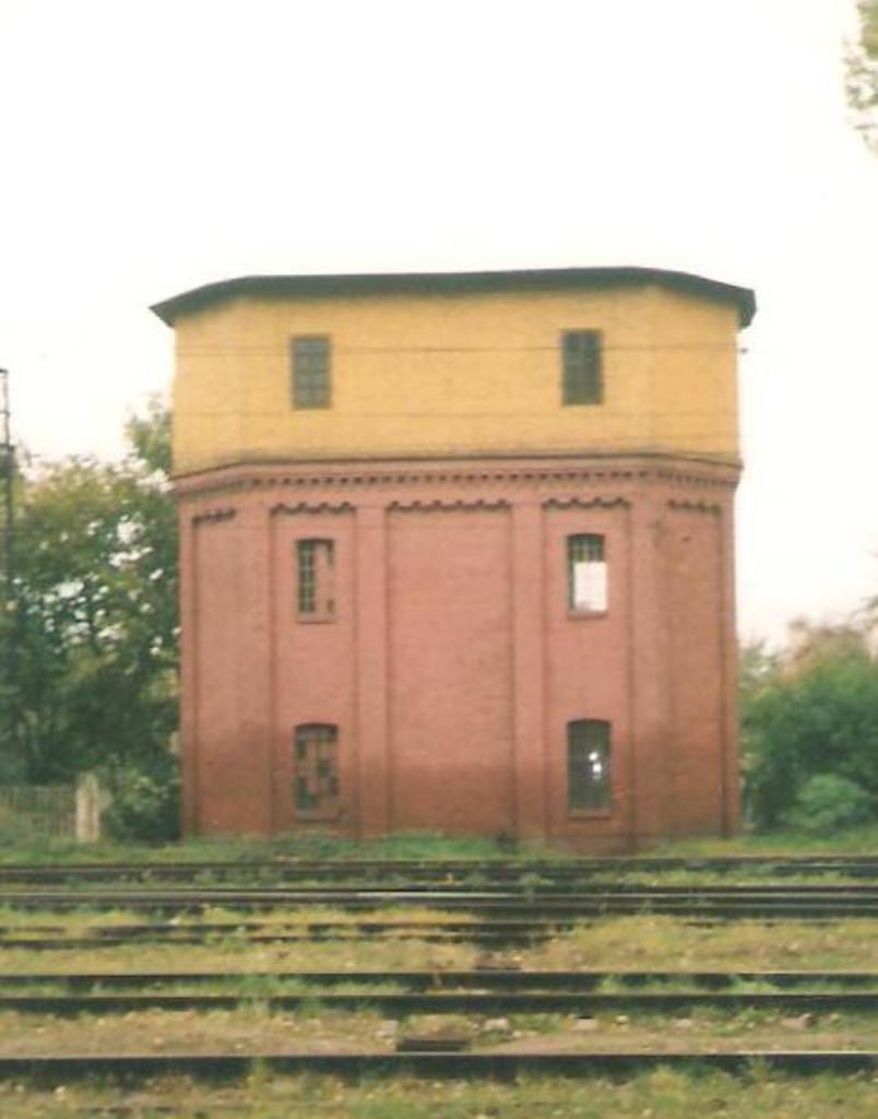 Chodzież. Kolejowa wieża wodna, widok zza torów..