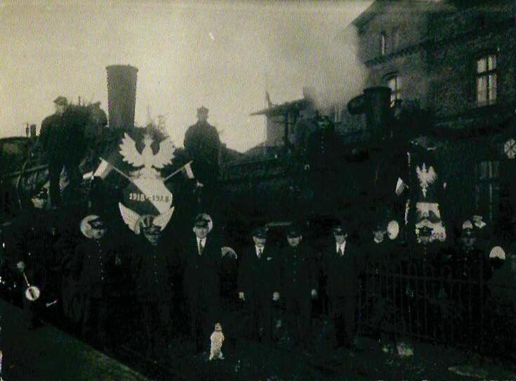 Fotografia obsługi stacji Chodzież, wykonana (w Chodzieży?) z okazji odzyskania niepodległości (10 rocznica).