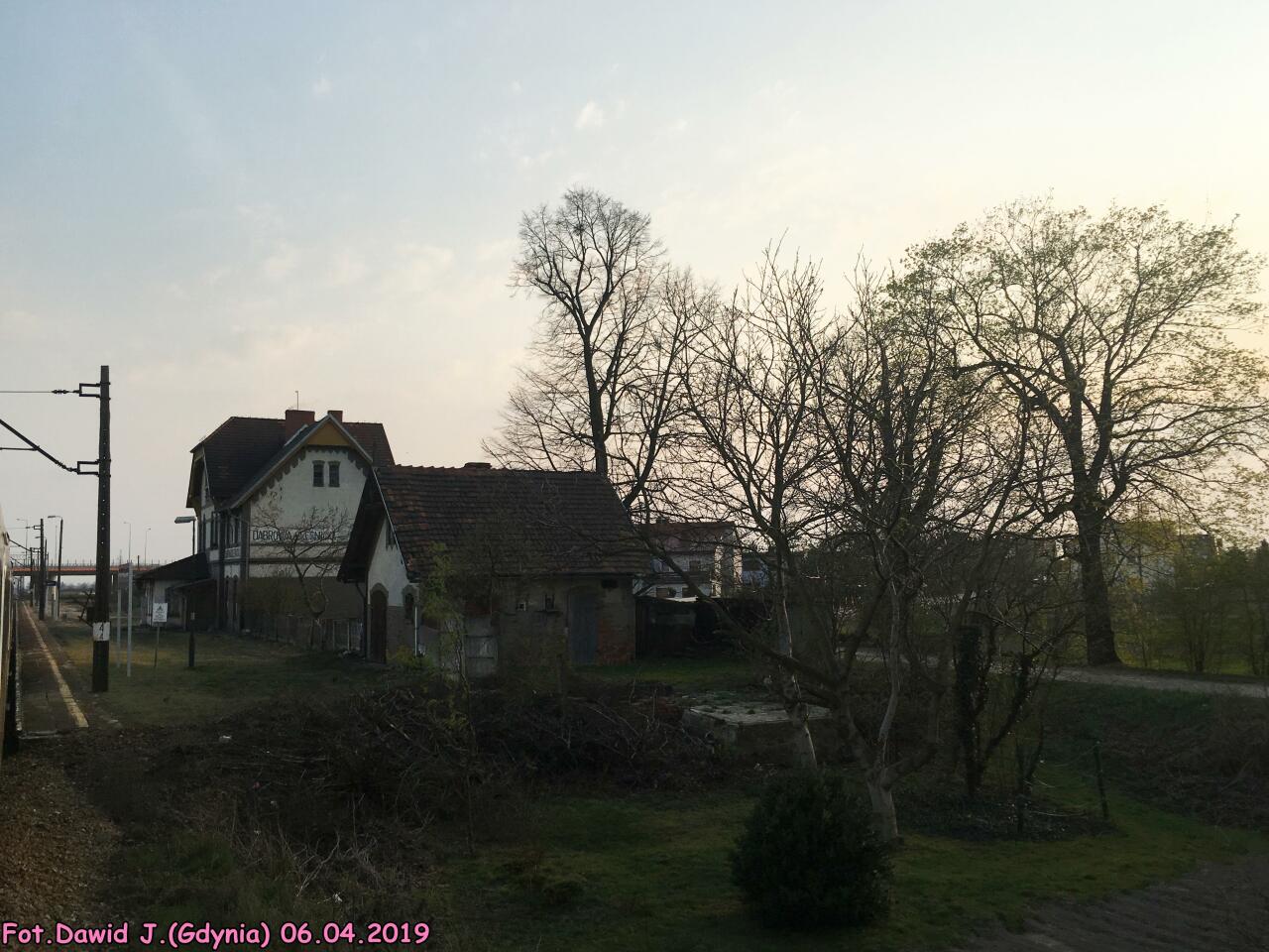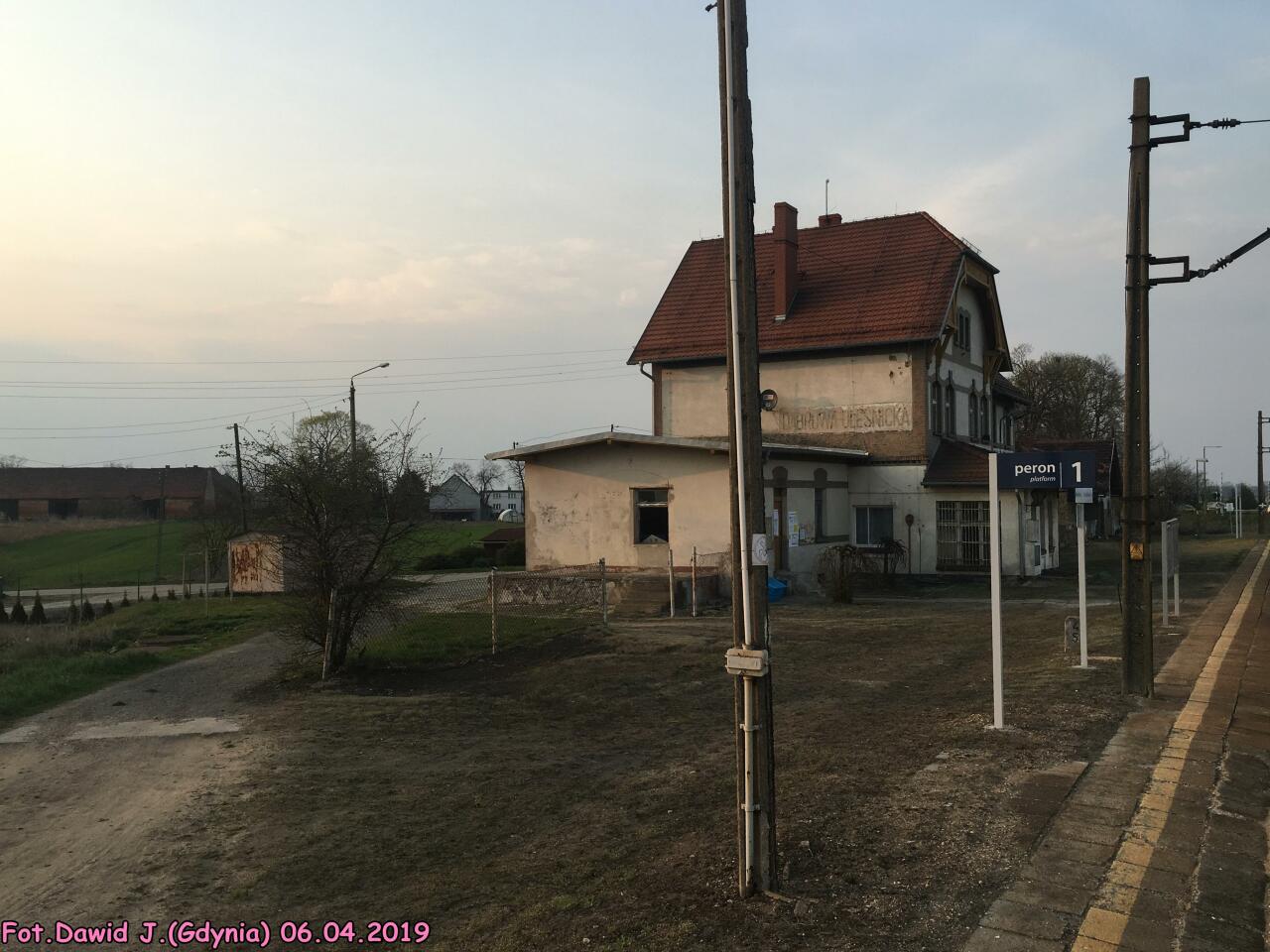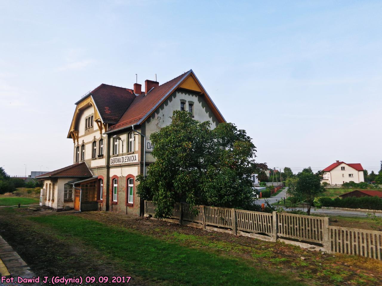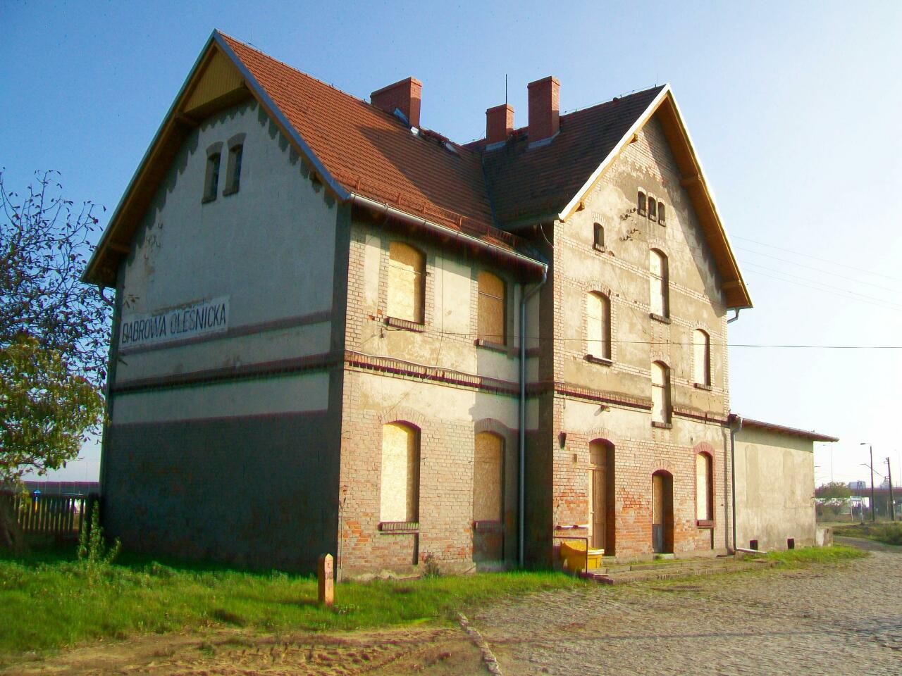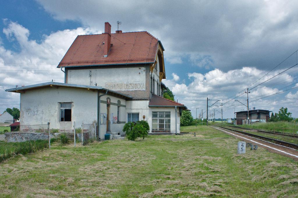 Opuszczony budynek dworca z zabitymi płytami OSB oknami. Przykry widok, a jeszcze we wrześniu br. parter nosił ślady użytkowania. Widok od strony peronów w kierunku zachodnim; w prawo Grabowno Wielkie, w lewo Oleśnica i Wrocław.