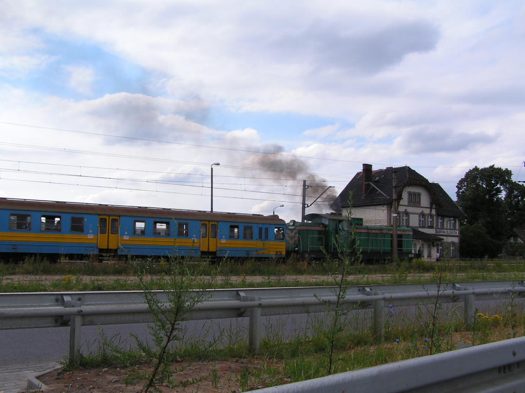 Dąbrowa Oleśnicka - przejazd zespołu: na czele SM42(839?)+EN57niebieski+EN57bordowy(niewidoczny).
