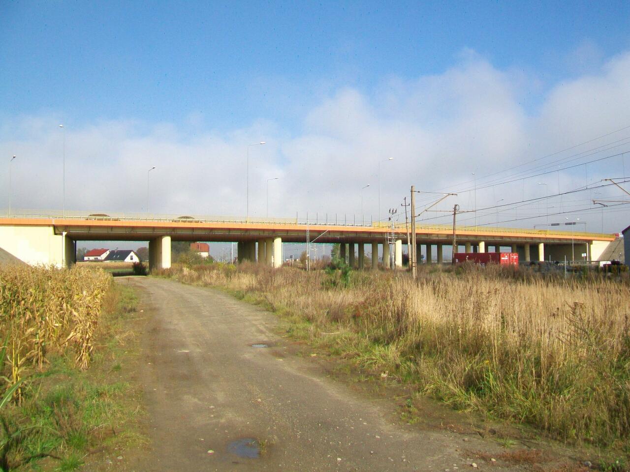 Wiadukt w ciągu drogi ekspresowej S8 nad wjazdami od strony Oleśnicy i Wrocławia (z prawej). Widok w kierunku południowo-wschodnim; w lewo perony.