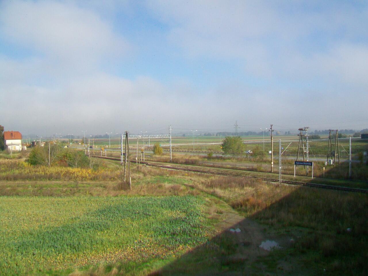 Widok na perony spod nieczynnego budynku dworca (z prawej, poza kadrem). Kierunek południowy (Oleśnica, Wrocław - przez posterunek odgałęźny Łukanów). W tle wiadukt w ciągu drogi S8.