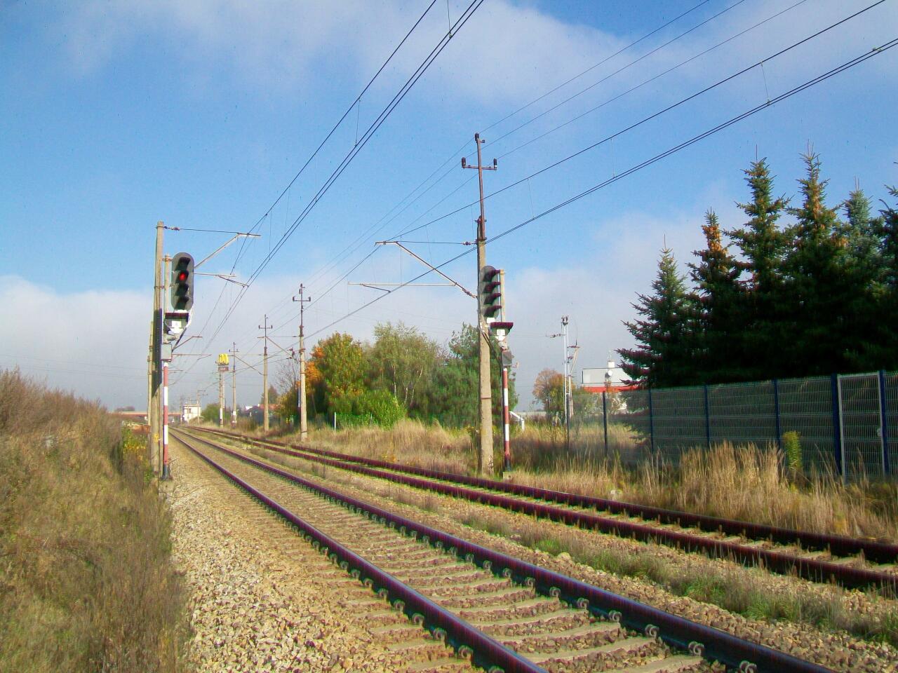 Semafory wjazdowe od strony Grabowna Wielkiego. Widok w kierunku południowym (perony). W tle droga S8.