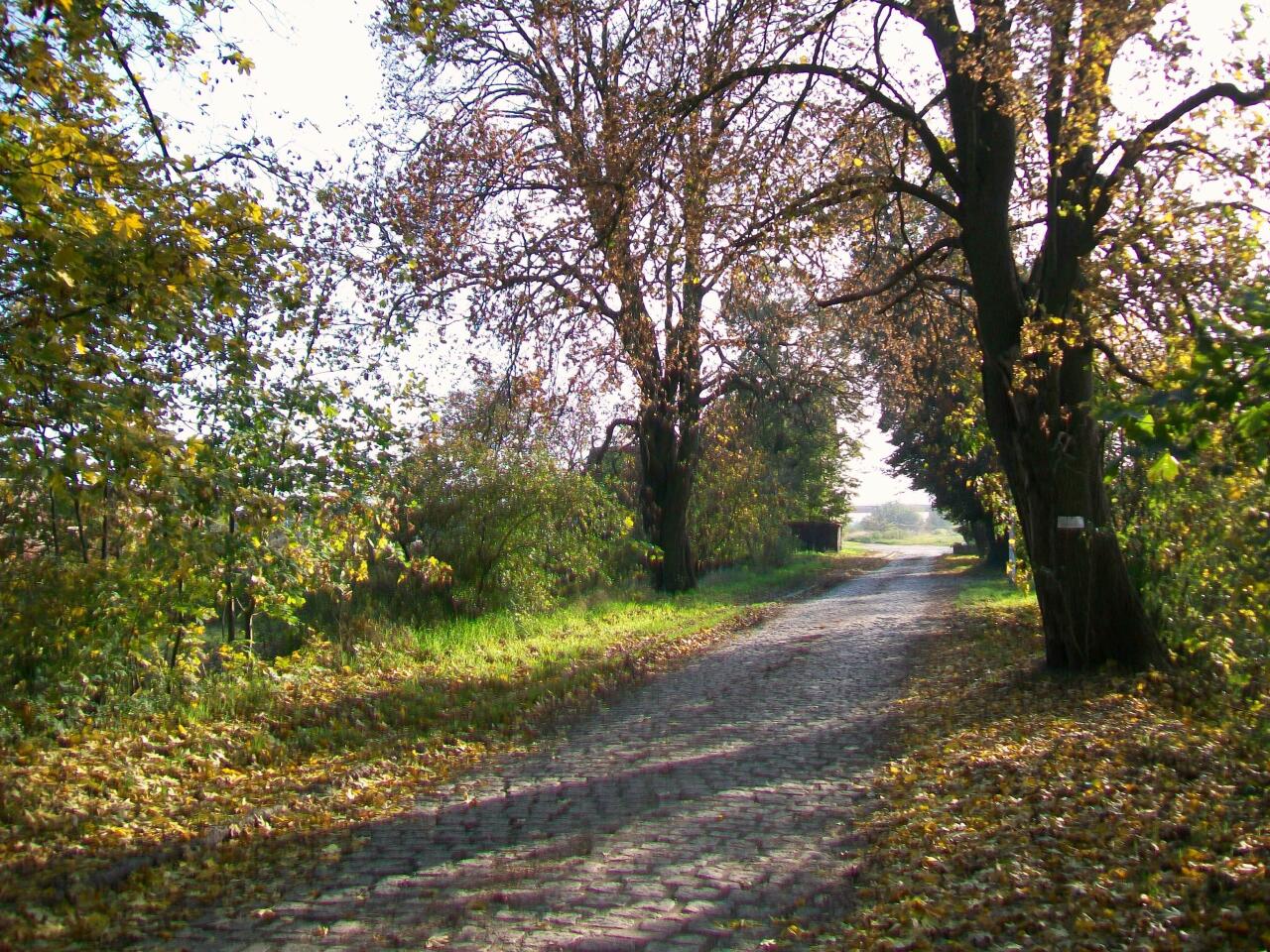 Droga dojazdowa do dworca, który skrył się za drzewami, w tle po lewej. Widok w kierunku południowym.