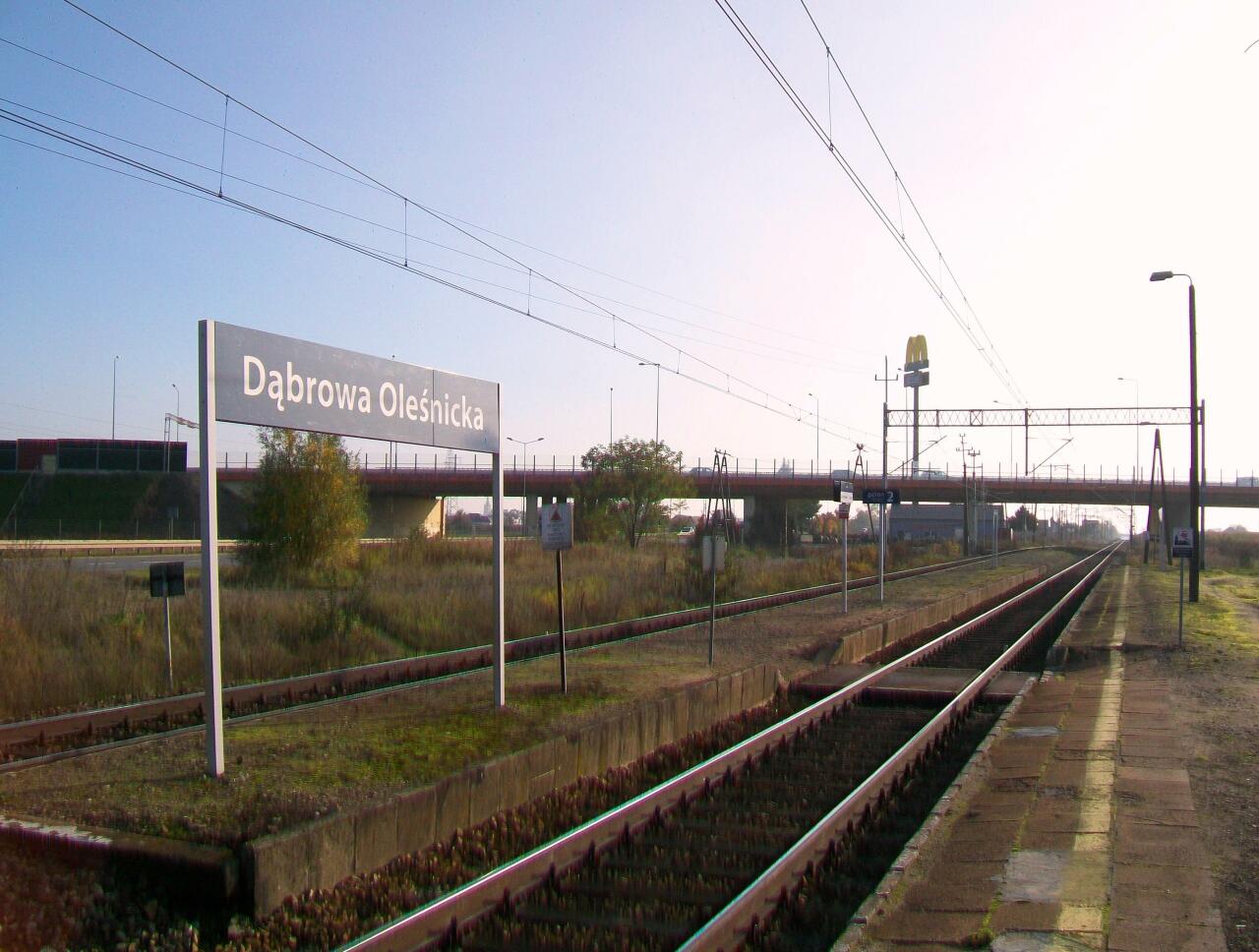 Panorama peronów na przystanku z przyczółka wiaduktu w ciągu drogi S8. W tle opuszczony budynek dworca. Na pierwszym planie DW 340 i węzeł drogowy Oleśnica Zachód. Widok w kierunku północnym (Grabowno Wielkie).