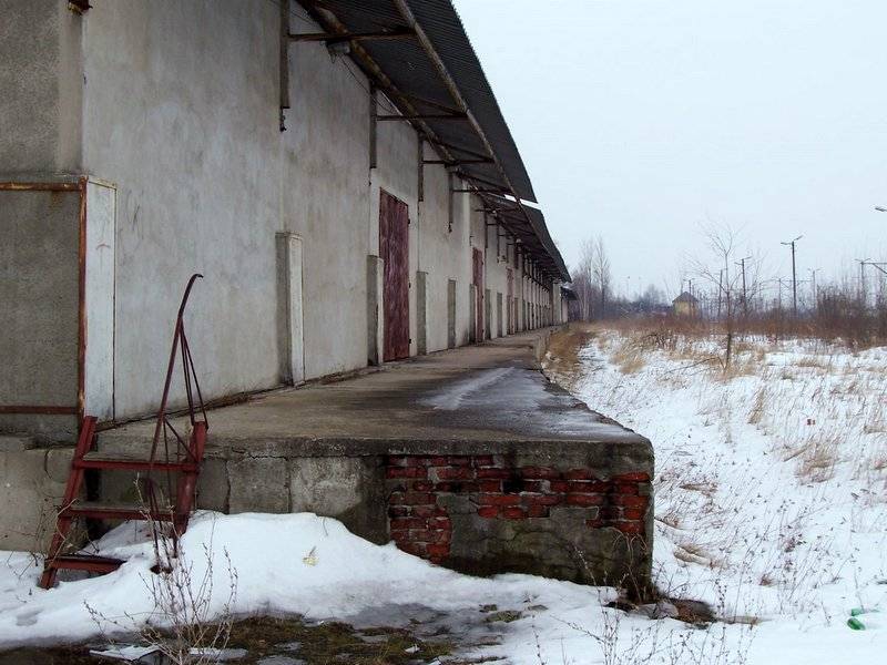 Na pierwszym planie po lewo zdewastowany wskaźnik W4, dalej murowana "budka" wagi wagonowej i magazyny.