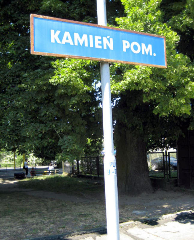 Stacja PKP Kamień Pomorski. Tablica z nazwą przystanku na słupie elektrycznym.
