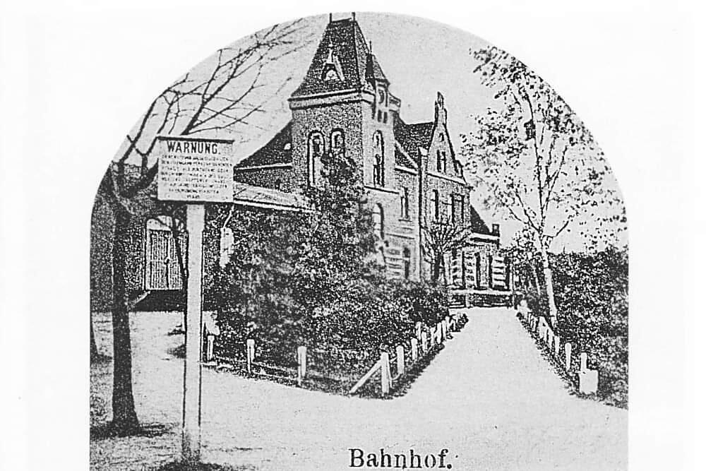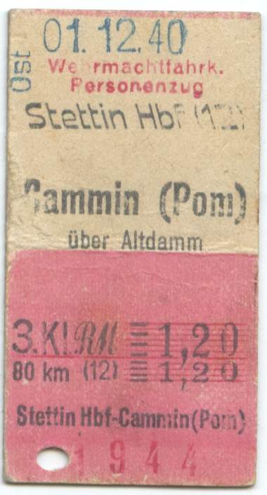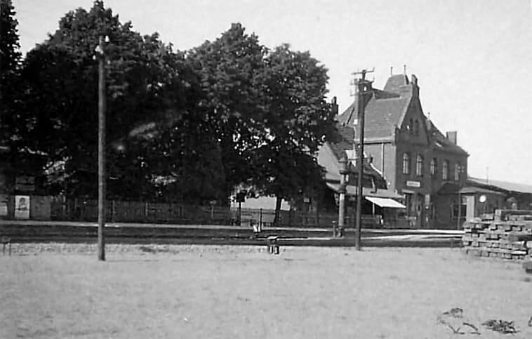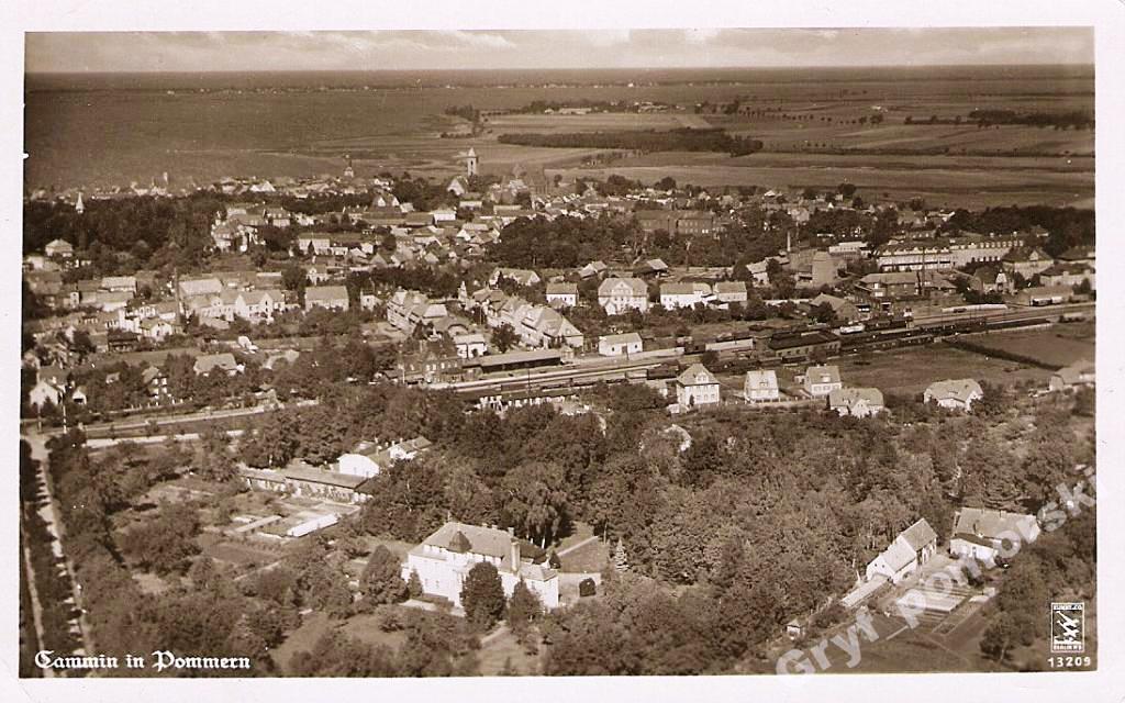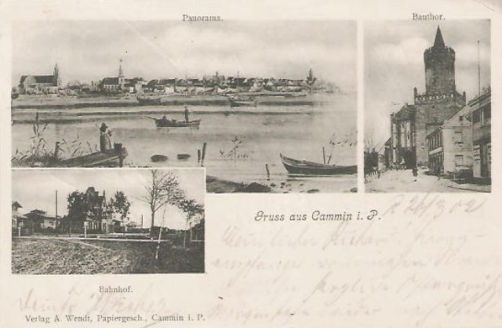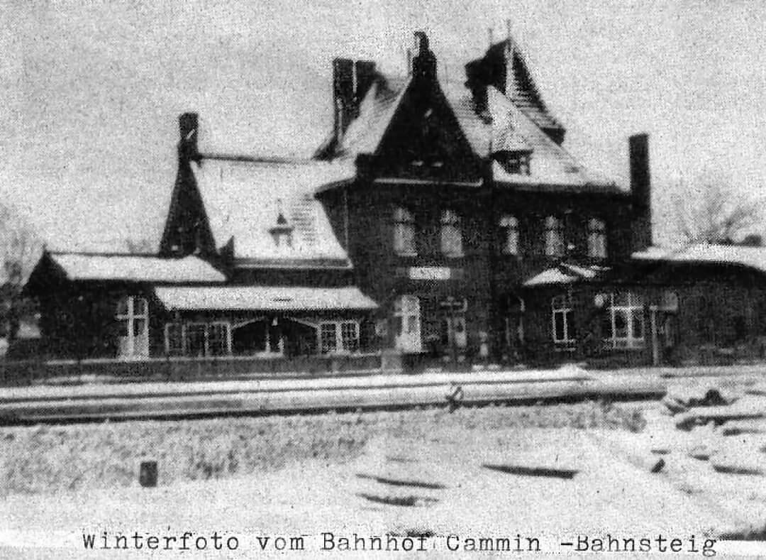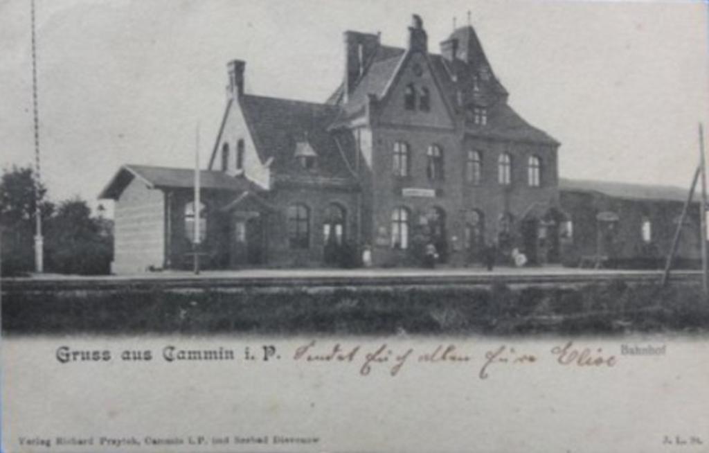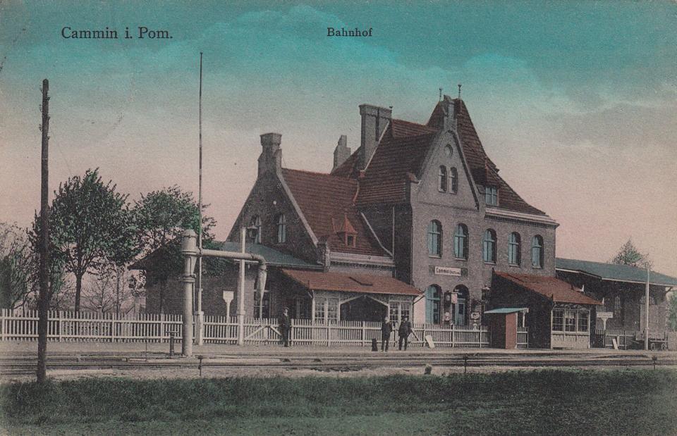 Dworzec kolejowy w Kamieniu Pomorskim na pocztówce z początku XX w. Poważnie uszkodzony w wyniku działań wojennych z 1945 r. jako ruina przez kilkanaście lat po wojnie straszył swym wyglądem, by zostać ostatecznie rozebranym na początku lat 60.