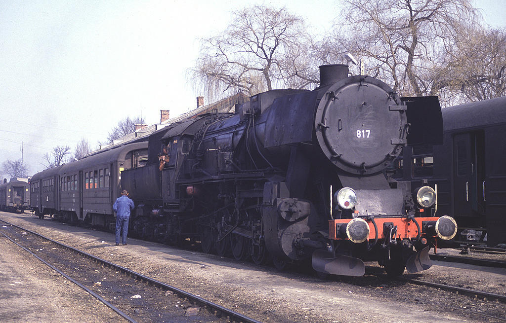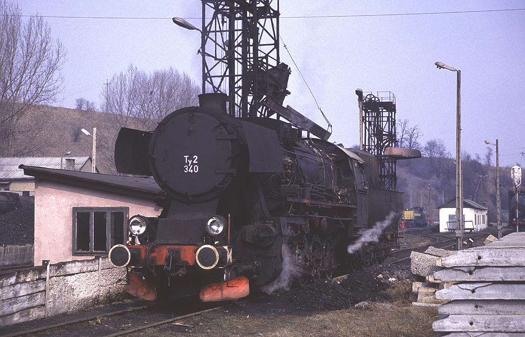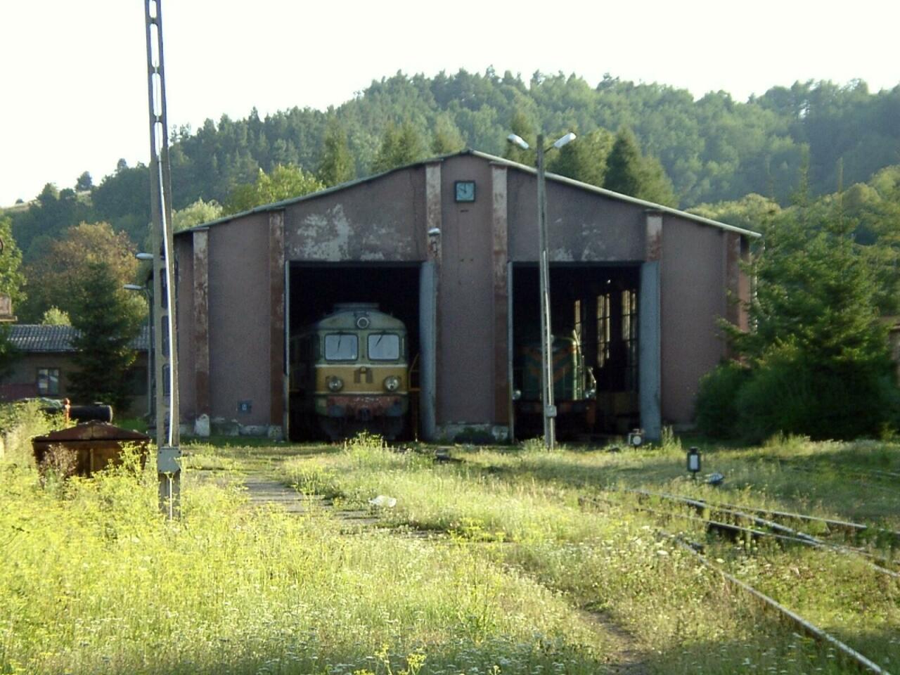Zagórz, km 2,0. Lokomotywownia. W szopie ST43 i SM42. Widok w kierunku południowo-zachodnim (Łupków).