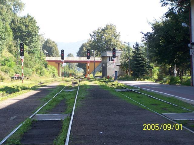 Widok na latarnię sygnałową na rozjeździe, przy końcu peronu, w kierunku południowo-zachodnim (Łupków).
