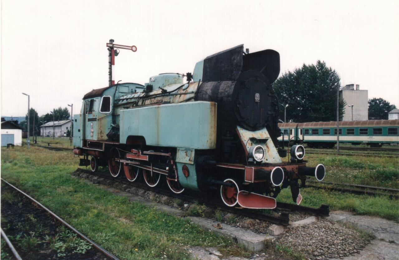 Tkt48-124 jako pomnik obok stacji. Trochę oddalony od peronu. W tle budynek dworca i perony. Widok w kierunku północnym.