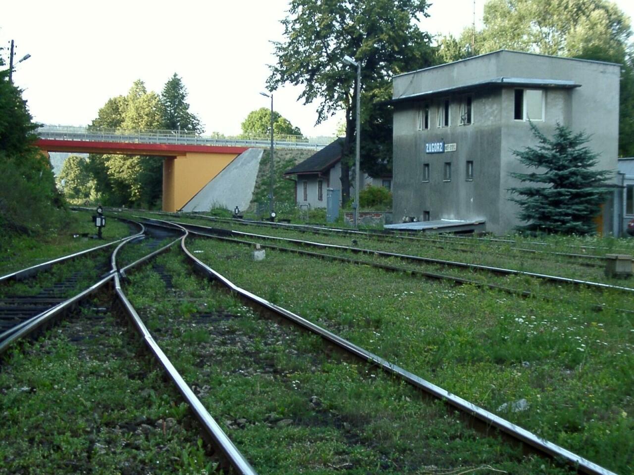 Perony na stacji Zagórz. Z prawej (niewidoczny) budynek dworca. W tle nastawnia dysponująca i wiadukt drogowy w ciągu ul. Wolności. Widok w kierunku Sanoka i Ustrzyk Dolnych.