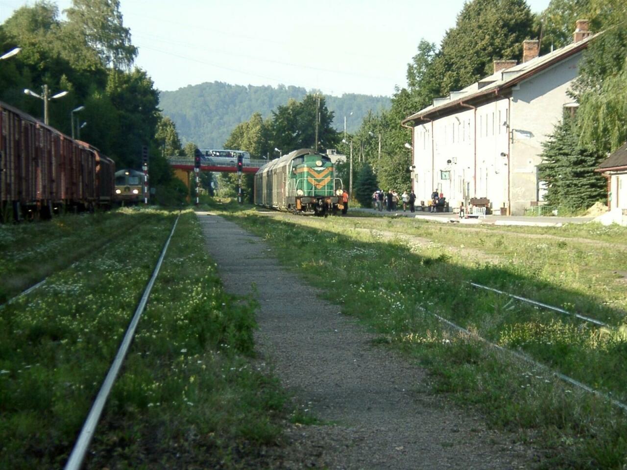 Widok na perony i fragment budynku dworca w kierunku południowo-zachodnim (Łupków).