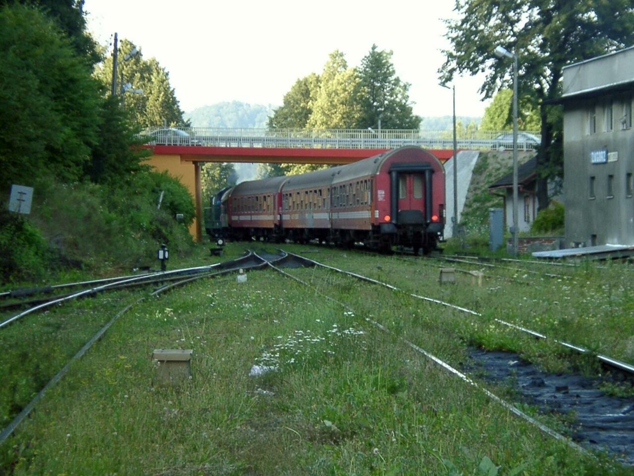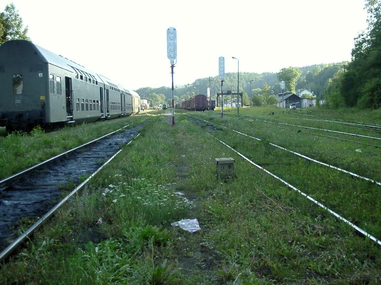 Zagórz, km 1,1. Przyjazd lokalnego składu wagonów piętrowych prowadzonych SM42. Po prawej budynek dworca, a w tle wiadukt drogowy w ciągu ul. Wolności. Widok w kierunku Sanoka i Ustrzyk Dolnych.