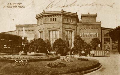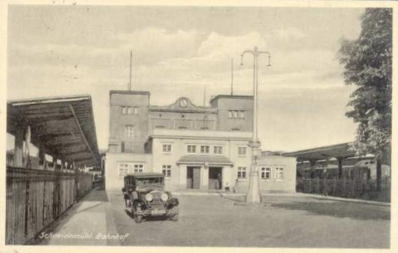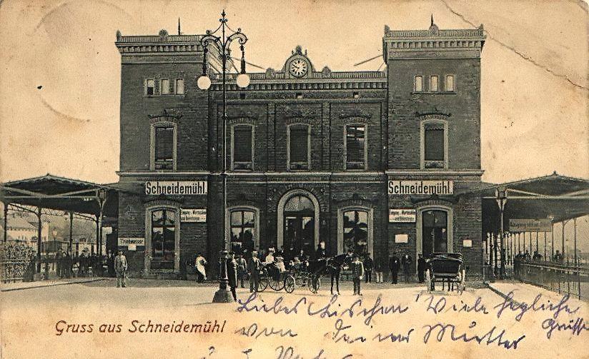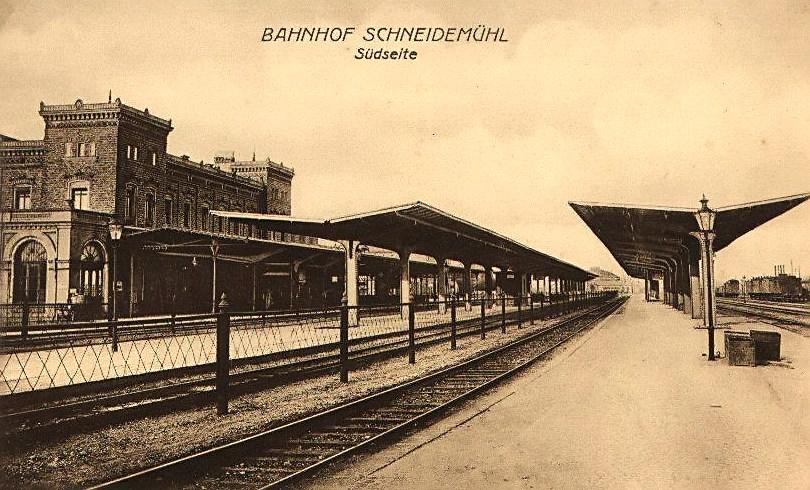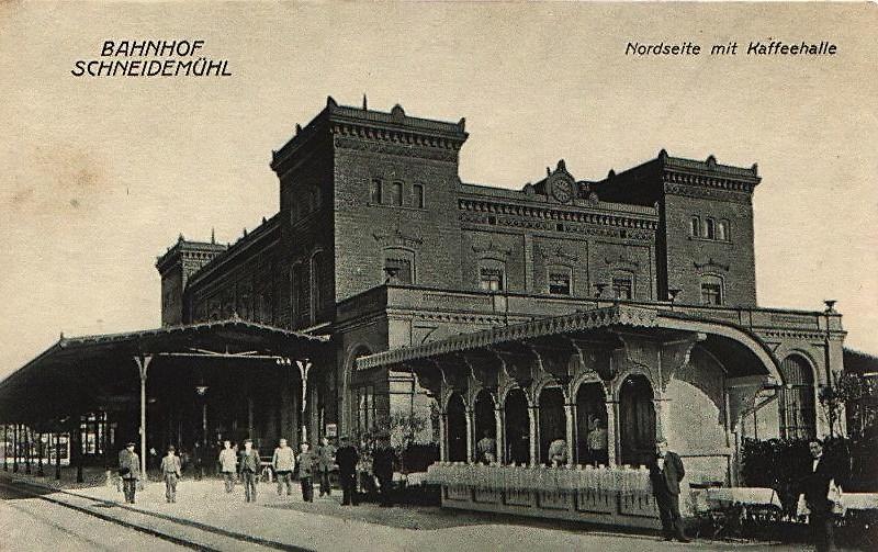 Budynek dworca od strony skwerku, położonego po jego wschodniej stronie. Po jego prawej (północnej) stronie perony (licząc od budynku) 5 i 6. Po jego lewej (południowej) stronie perony (licząc od budynku) 1, 2, 3, 4. Widok w kierunku zachodnim, od strony wjazdów ze Złotowa/Chojnic (perony północne) oraz Nakła nad Notecią/Bydgoszczy, Chodzieży/Poznania, Czarnkowa/Bzowo Goraja (perony południowe). Ze zbiorów Miłosza Telesińskiego.