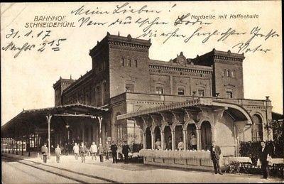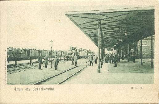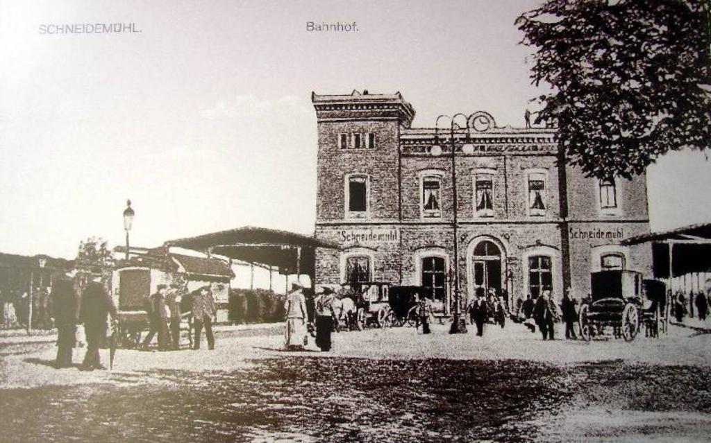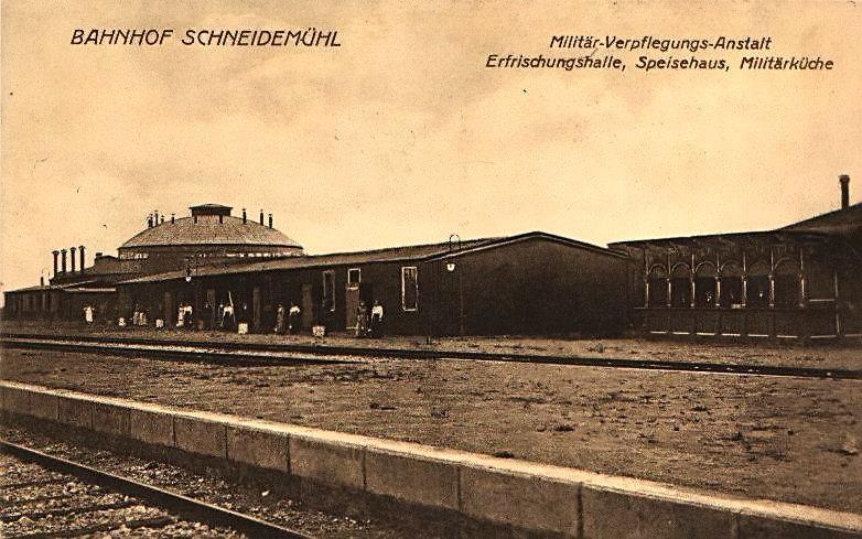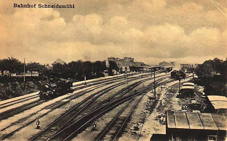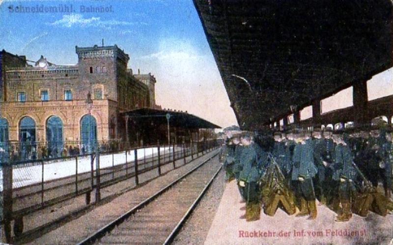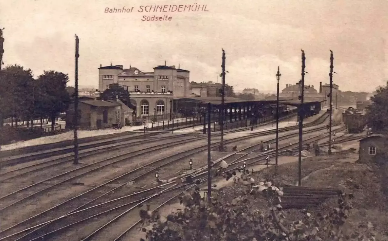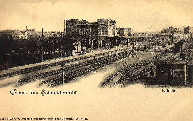 Widok na obiekty służące wojsku (kuchnia, jadalnia, łaźnia), położone w północno-wschodniej części dworca, od strony peronu 6, położonego po północnej stronie dworca (z prawej, poza kadrem). W tle okrągła lokomotywownia. Kierunek południowo-wschodni, w lewo wyjazdy na Złotów/Chojnice, Nakło nad Notecią/Bydgoszcz, Chodzież/Poznań, Czarnków/Bzowo Goraj. Ta część stacji obsługiwała ruch na pierwszym z wymienionych kierunków.
