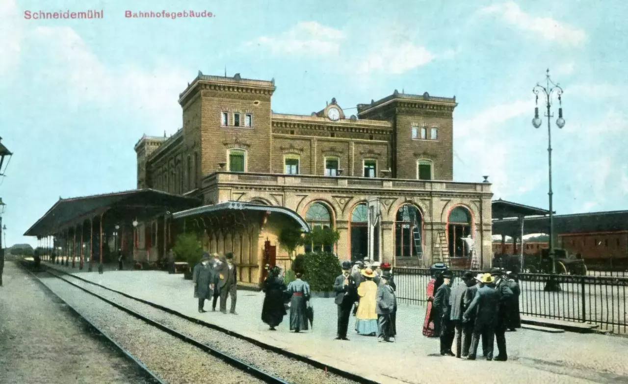 Na peronie 3 w Pile, południowa strona dworca - zdjęcie koloryzowane. Widok w kierunku wschodnim, od strony wjazdów z Trzcianki/Krzyża, Wałcza/Stargardu, Płytnicy/Szczecinka.