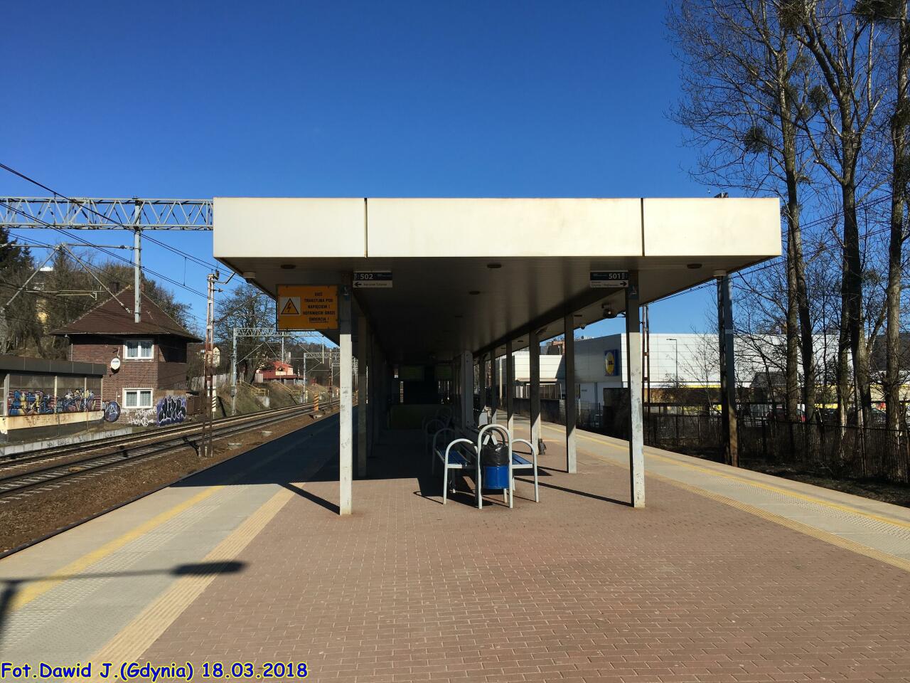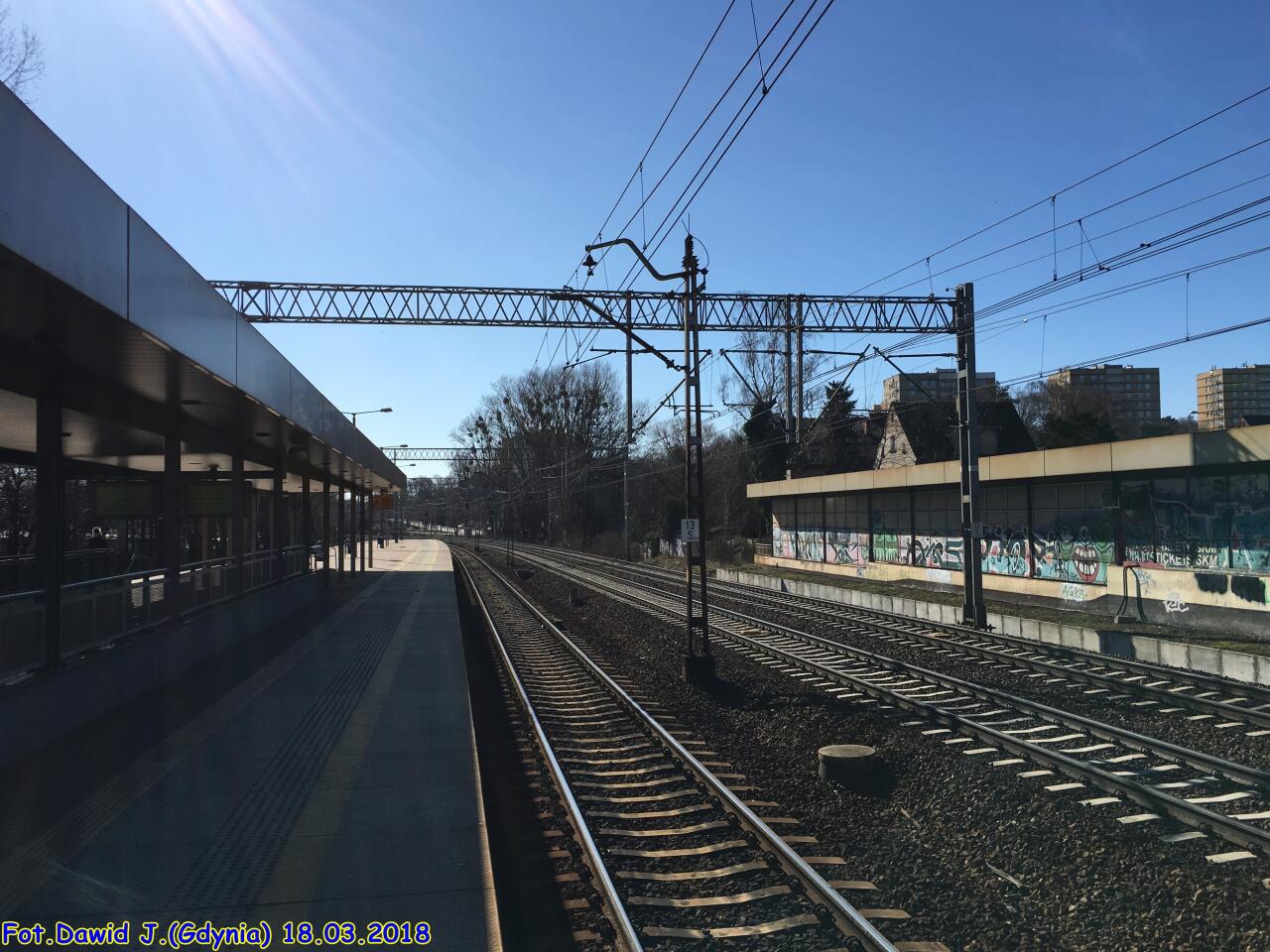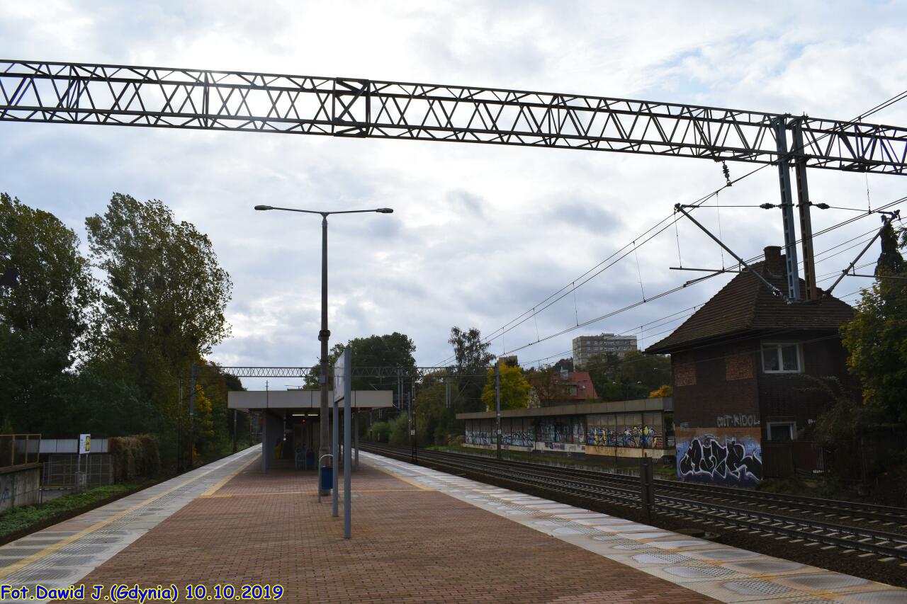 Widok w stronę Gdyni. Tor przy peronie ma nr 502, a następne to nry 1 i 2. Widzimy zachodnią krawędź peronu, wiatę, kawałek zabudowanego wyjścia po stronie zachodniej przystanku (przystosowane dla osób niepełnosprawnych - podjazd), tarczę ostrzegawczą Gdyni Orłowa dla toru nr 2 (tor nr 1 ma semafor SBL 210m wcześniej, tj. za mną) i byłą nastawnię posterunku odstępowego (?).