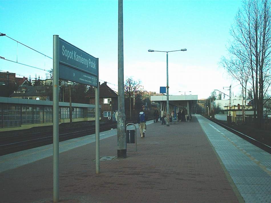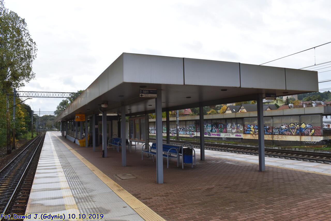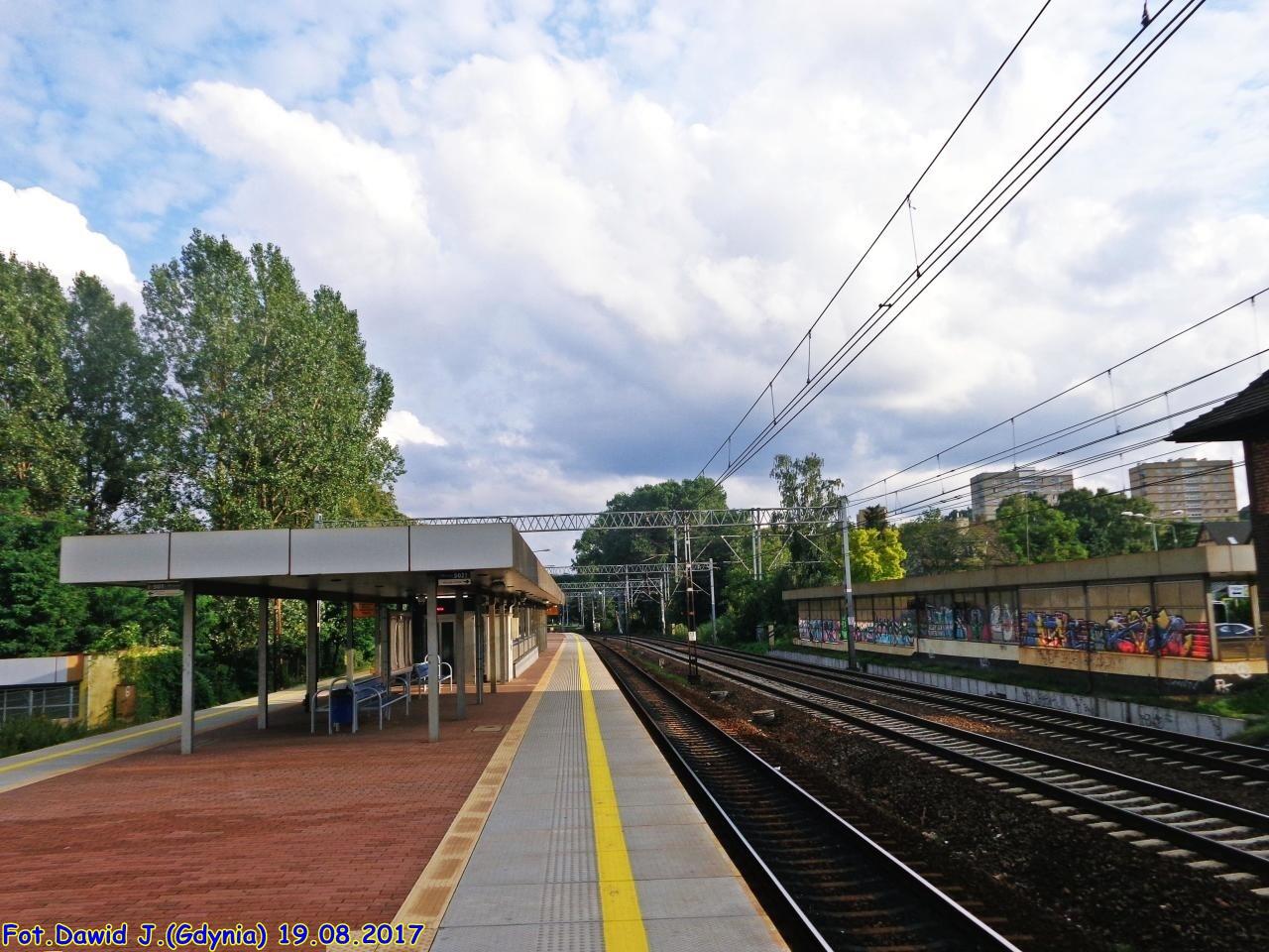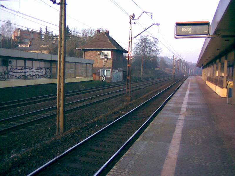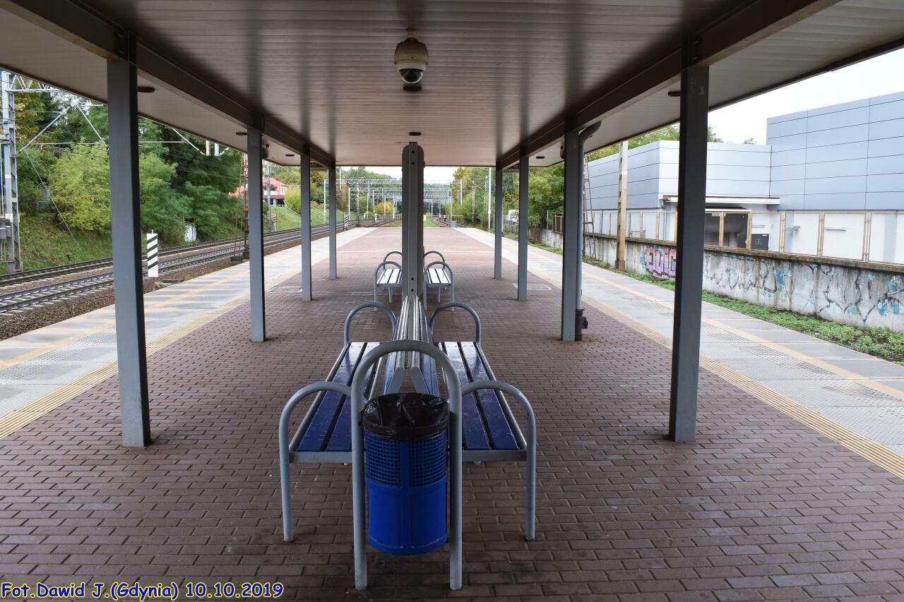 Widok w stronę Gdyni. Tor przy peronie ma nr 502, a następne to nry 1 i 2. Widzimy zachodnią krawędź peronu, wiatę, kawałek zabudowanego wyjścia po stronie zachodniej przystanku (przystosowane dla osób niepełnosprawnych - podjazd), tarczę ostrzegawczą Gdyni Orłowa dla toru nr 2 (tor nr 1 ma semafor SBL 210m wcześniej, tj. za mną) i byłą nastawnię posterunku odstępowego (?).