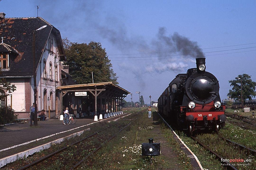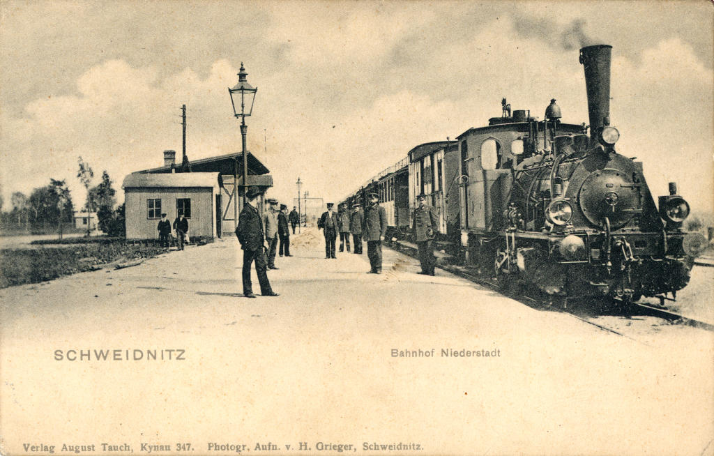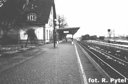 Z lewej dawny budynek dworca. W centrum kadru peron ze składem. Widok w kierunku północno-wschodnim (Kobierzyce/Wrocław). Ze zbiorów Adama Pacześniaka.