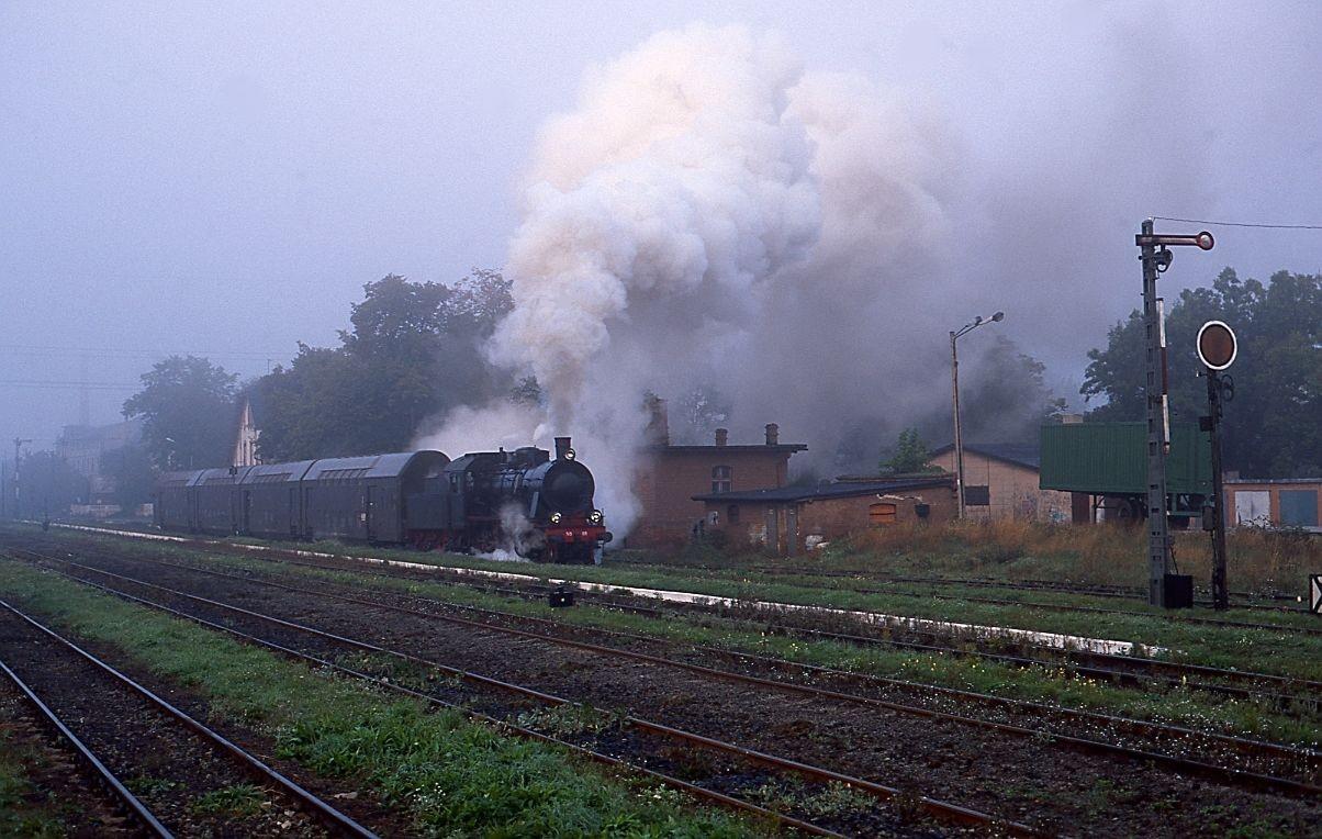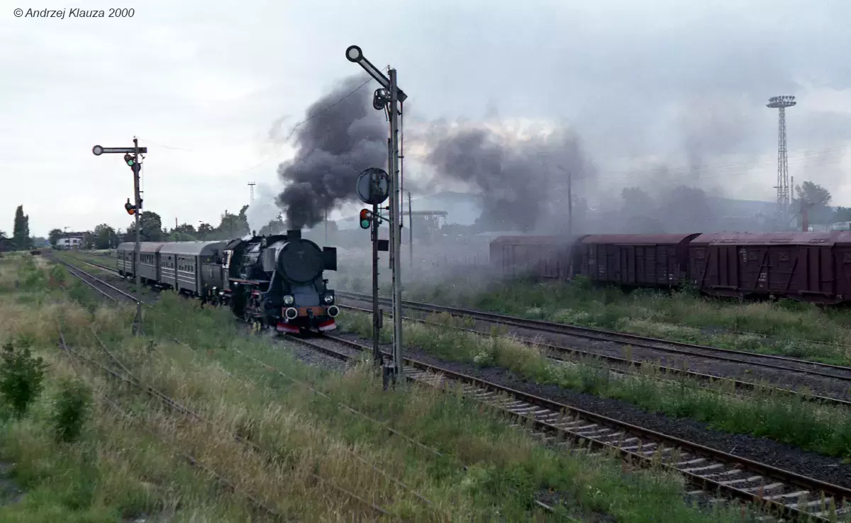 Ty42-1 z pociągiem specjalnym z Wrocławia Gł. do Jaworzyny Śl. Pociąg mija semafor drogowskazowy F z tarczą ostrzegawczą do semafora wyjazdowego J. Widok w kierunku północno-wschodnim (Kobierzyce/Wrocław).