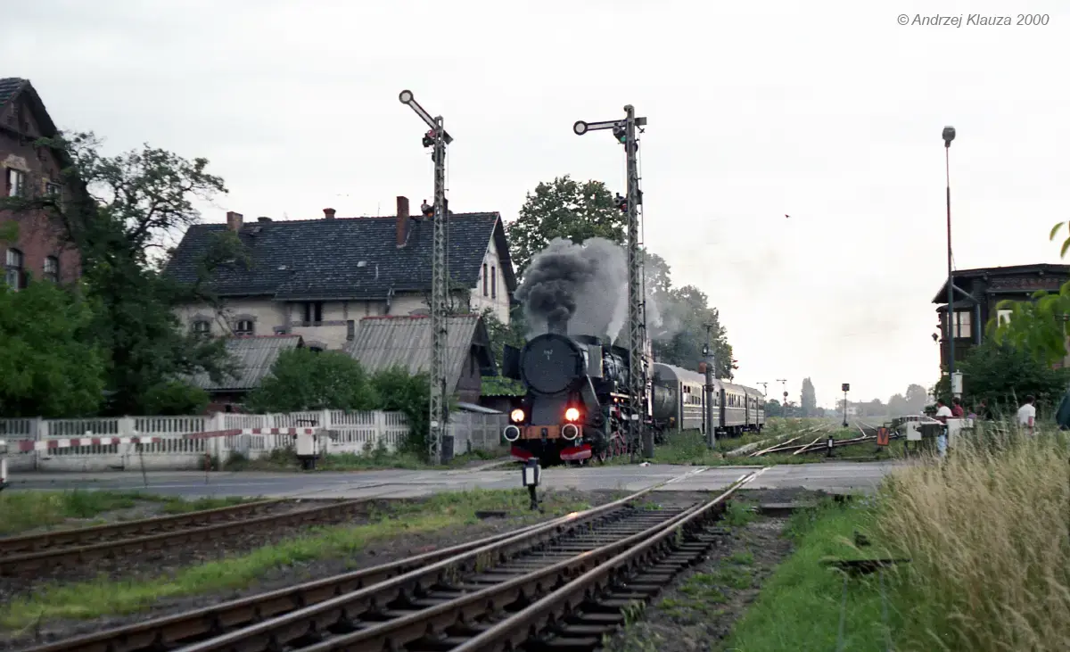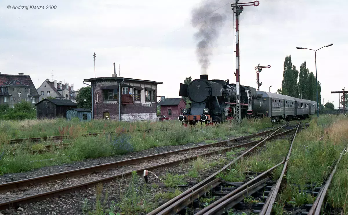 Ty42-1 z pociągiem specjalnym wyjeżdża do stacji Świdnica Miasto. Przejazd kolejowy przez ul. Westerplatte z nastawnią wykonawczą ŚP1, obecną dysponująca ŚP. Widok w kierunku północno-wschodnim, od strony wjazdów ze Świdnicy Miasto (tor z lewej) i Świdnicy Kraszowice (tor z prawej).