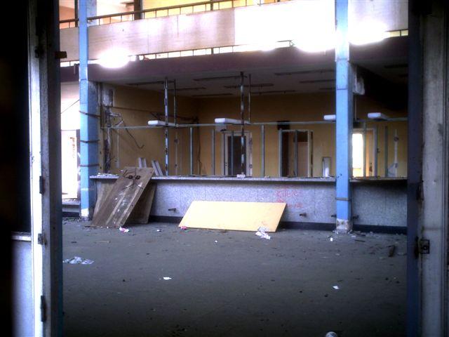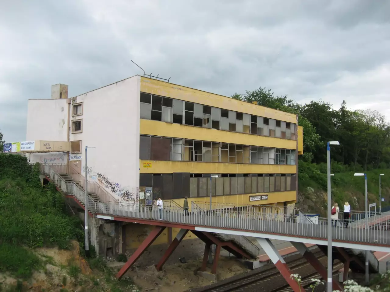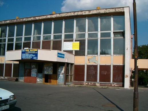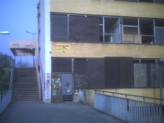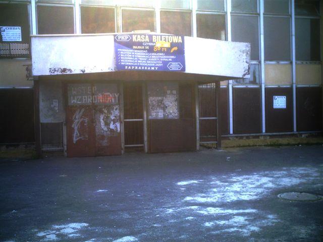 Fragment budynku dworca od strony kładki nad torami. Na wprost wyjście do miasta, w prawo - na perony.