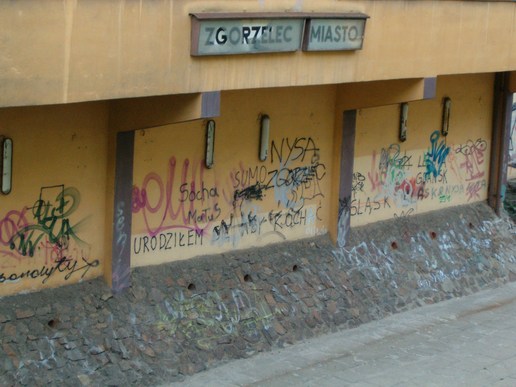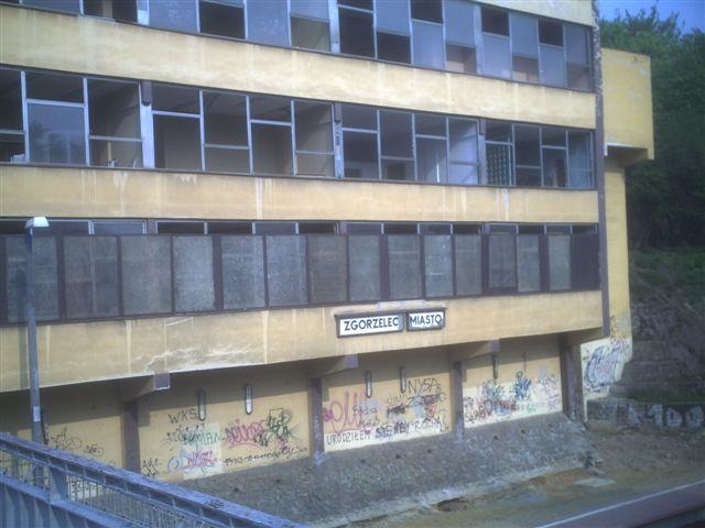 Tablica z nazwą stacji na nieczynnym dworcu, od strony peronów. Widok w kierunku zachodnim: prawo Węgliniec, w lewo stacja Zgorzelec (Ujazd) i Jerzmanki/Lubań Śląski.